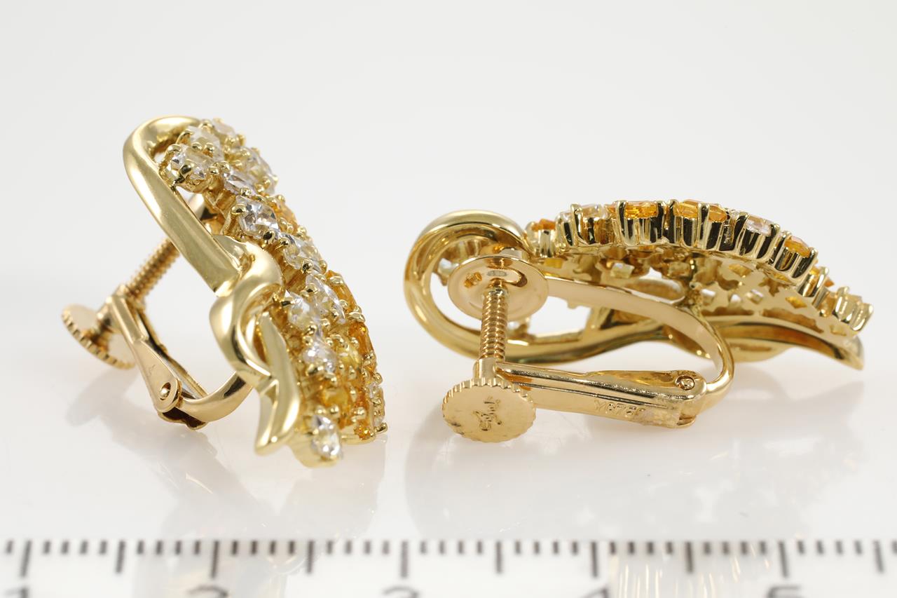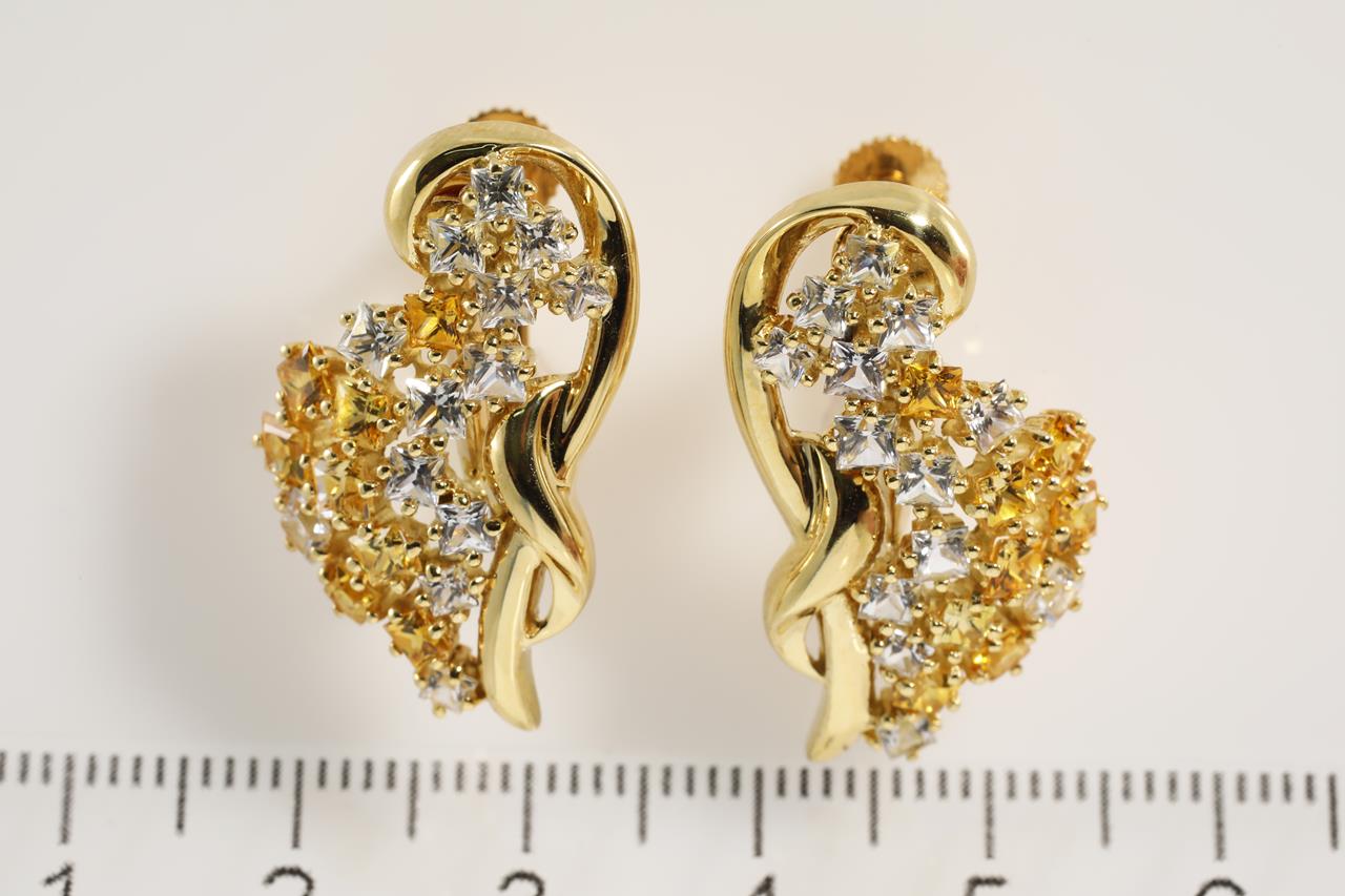 Sapphire clip-on/screwback earrings (for pierced and non pierced ears) with yellow & white princess cut Sapphires totalling 4.44cts. 18ct yellow gold. 12.1g. (Pre-owned)