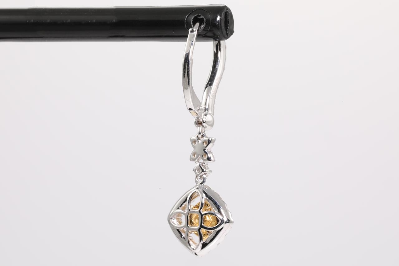 Diamond hinge back earrings with centre yellow cushion cut Diamonds and round yellow diamonds totalling 0.33cts (Estimated grading: SI-P1) and white Diamonds totalling 0.88cts (Estimated grading: G-H SI). 22ct yellow & 18ct white gold. Weight: 4.8g. (As new)