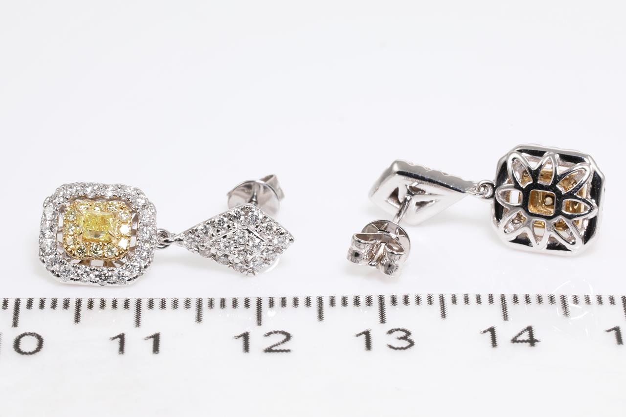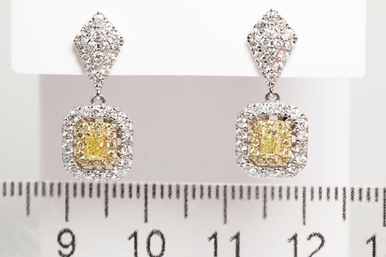 Diamond earrings with centre yellow radiant cut Diamonds and round brilliant cut diamonds totalling 0.30cts (Estimated grading: FY SI-P1) and remaining white Diamonds totalling 0.85cts (Estimated grading: G-H SI). 18ct yellow & white gold. Weight: 4.8g. (As new)