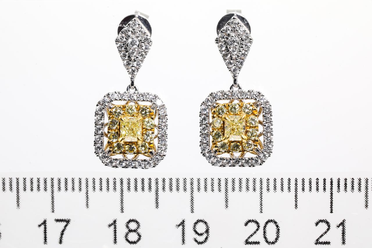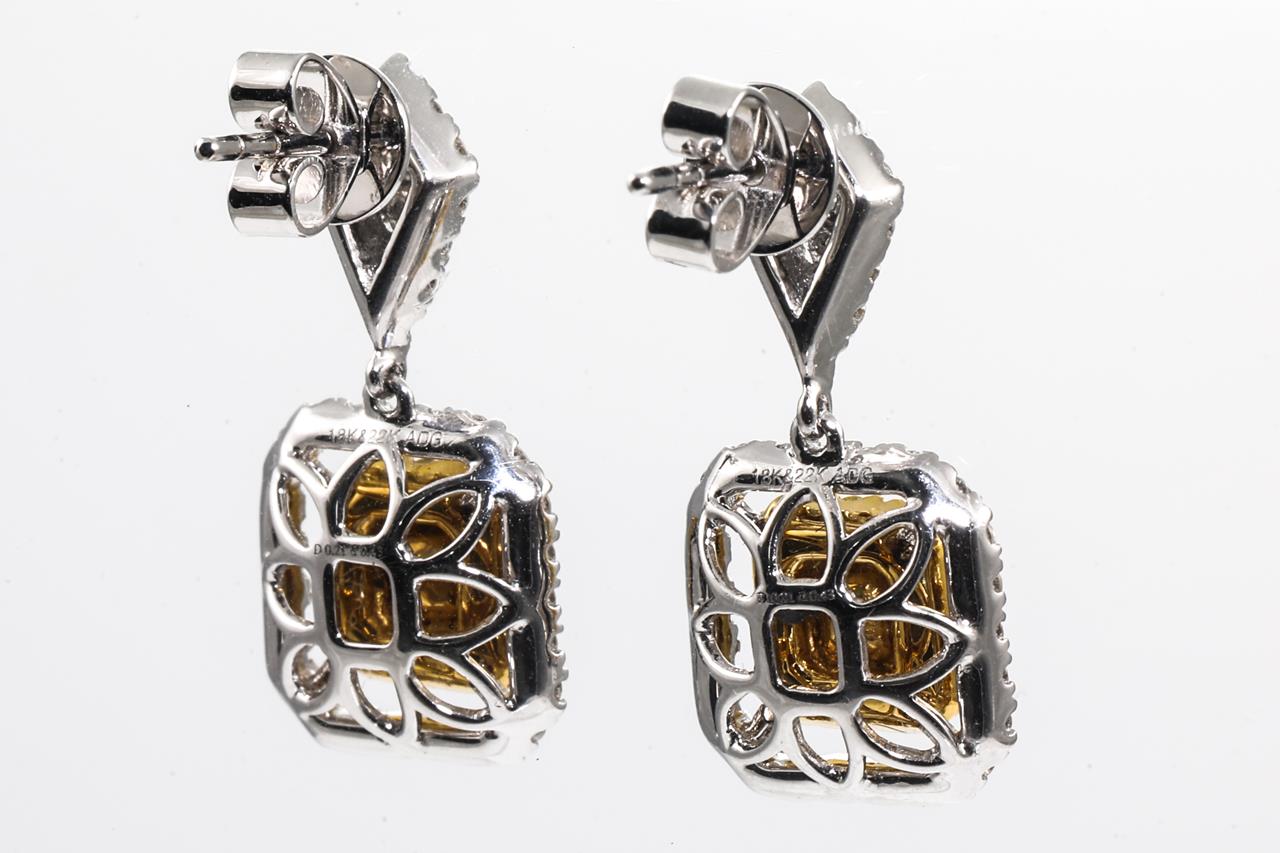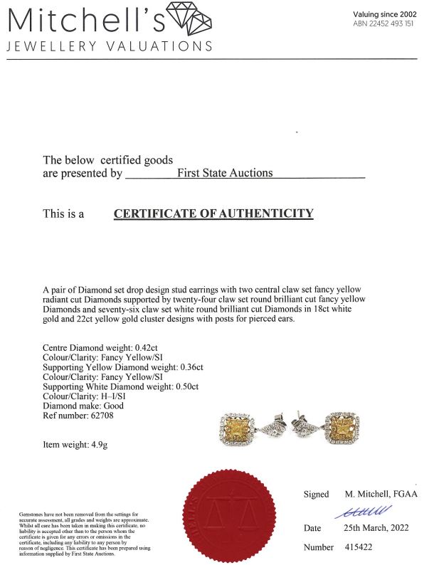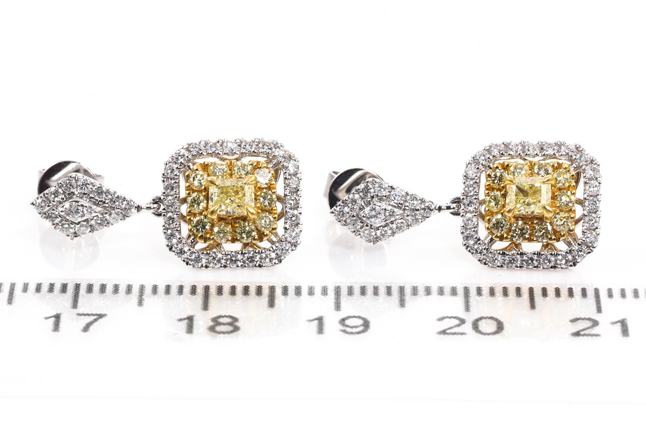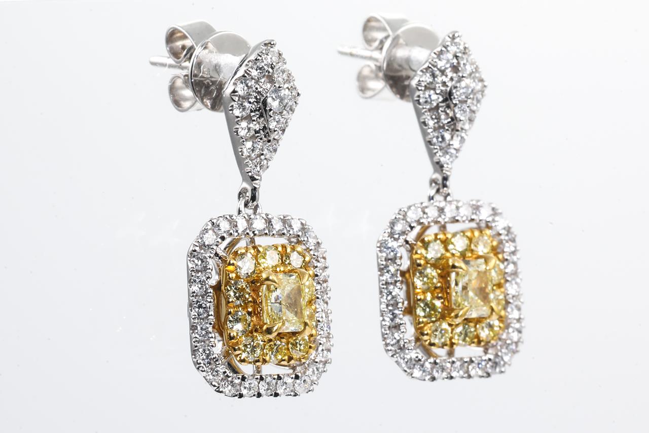 Diamond earrings with 2 centre radiant cut Diamonds totalling 0.42cts (Estimated grading: Fancy yellow SI) and remaining round yellow Diamonds totalling 0.36cts (Estimated grading: Fancy yellow SI) & round white Diamonds totalling 0.50cts (Estimated grading: H-I SI). 18ct white and 22ct yellow gold. Weight: 4.9g With Certificate #415422. (As New)
