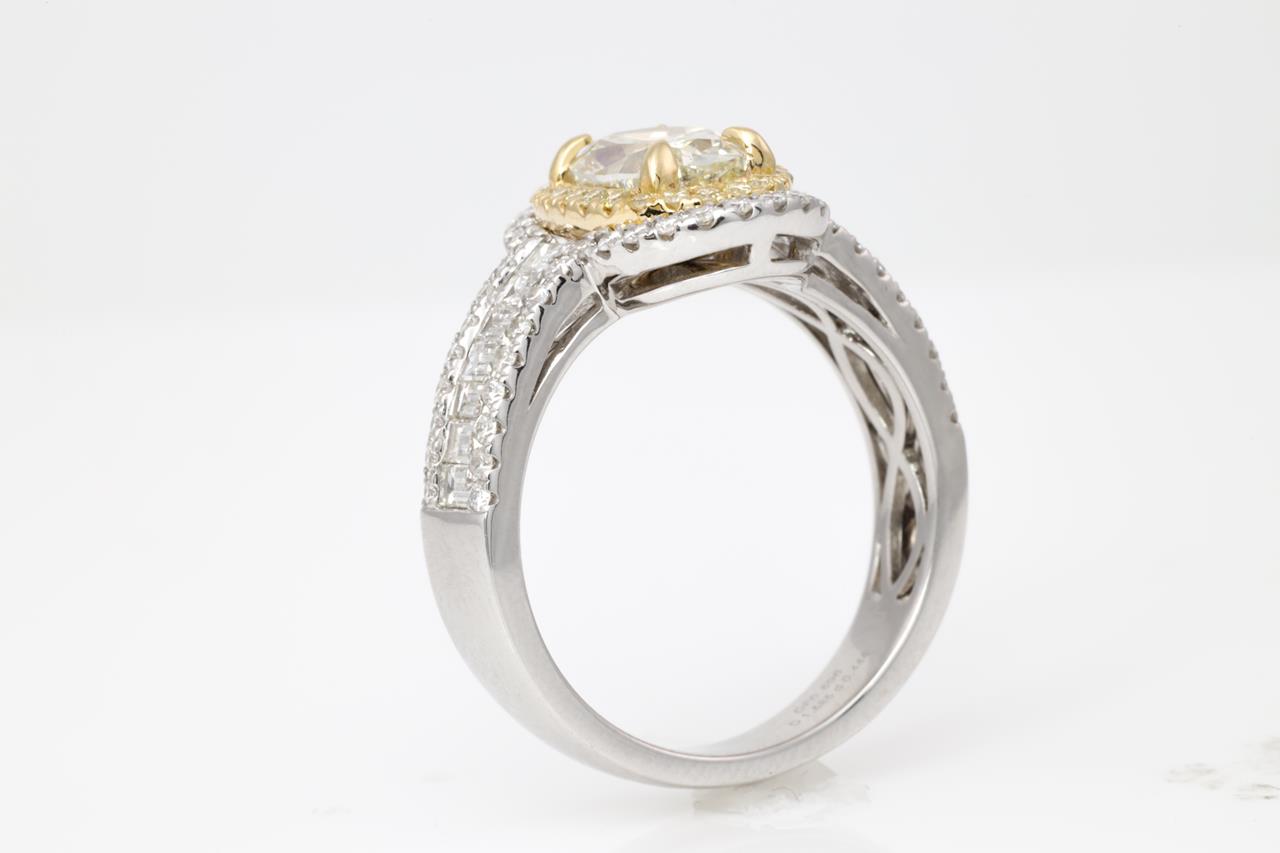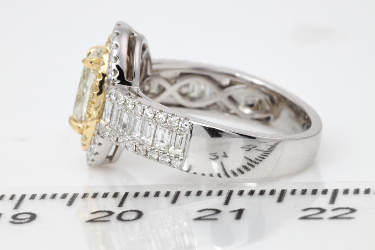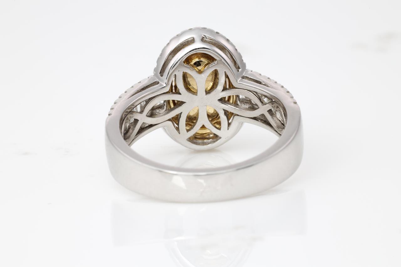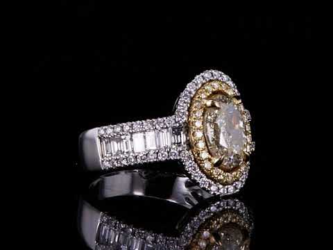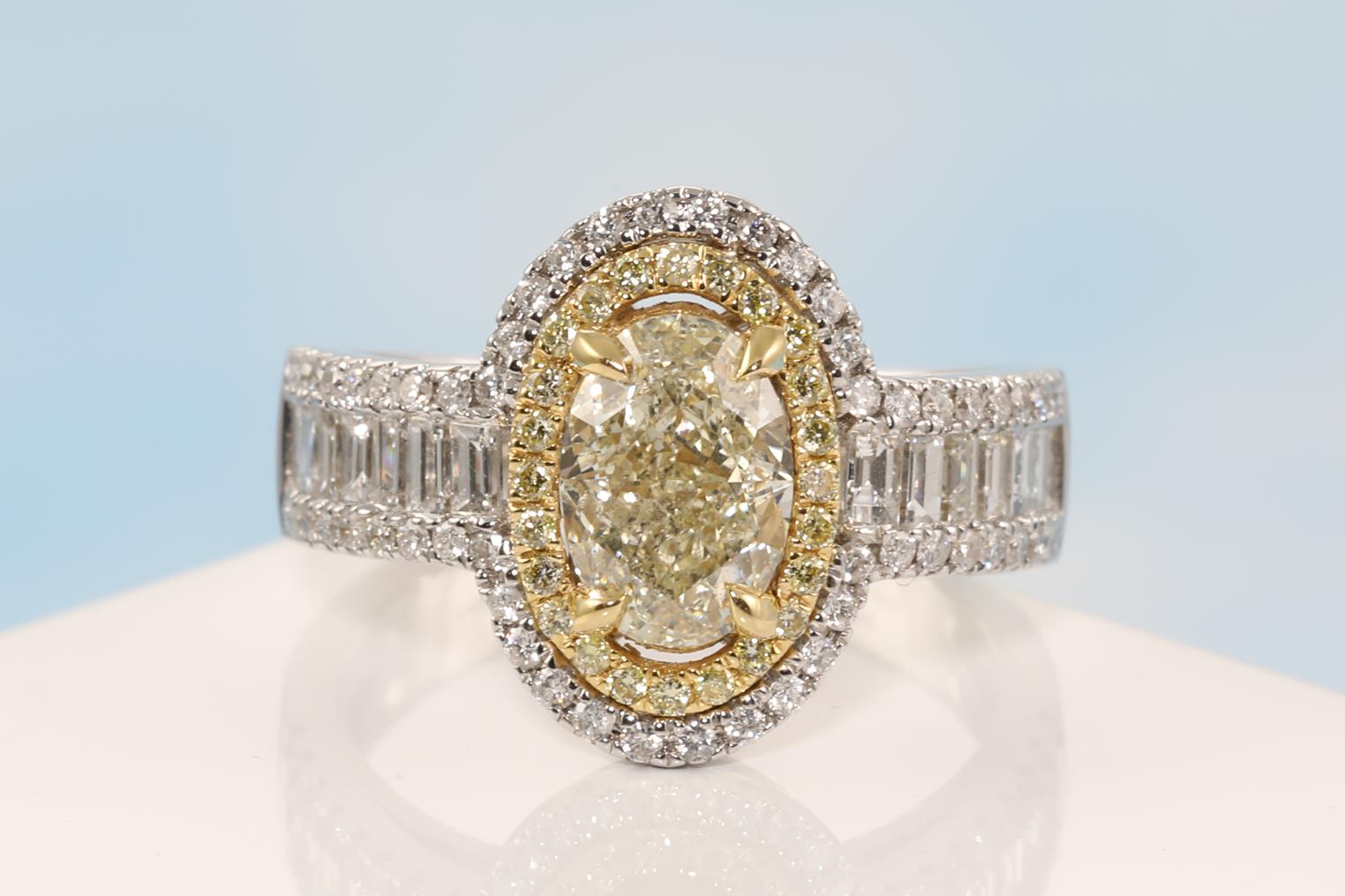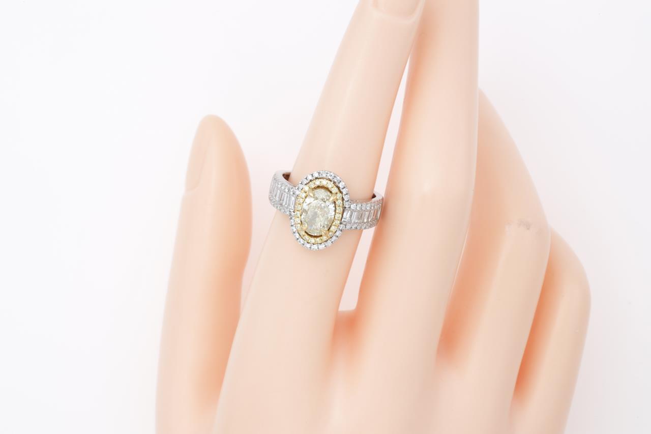 Diamond double halo ring with a centre oval Diamond of 1.59ct (Estimated grading: Fancy Light Yellow SI2), surrounding round & baguette cut white and yellow Diamonds totalling 1.04cts (Estimated grading: G-H SI, FY SI). 14ct white & yellow gold. Ring size: N. Weight: 6.4g. With certificate #414840. (As New)
