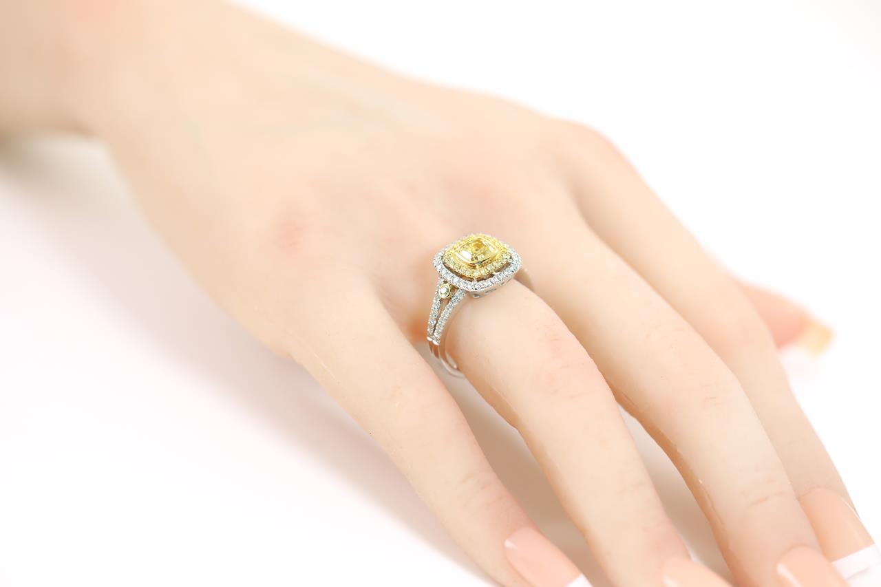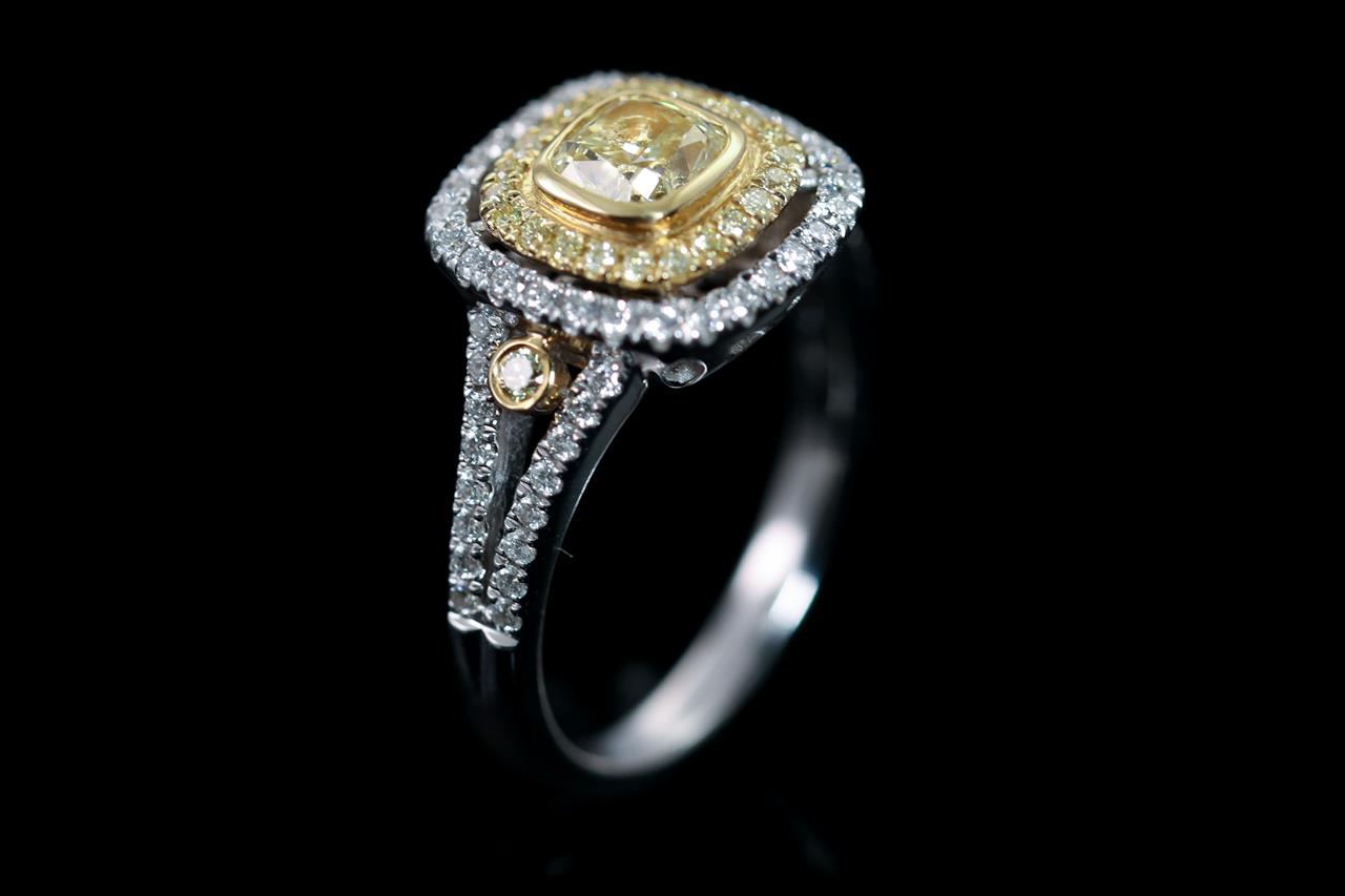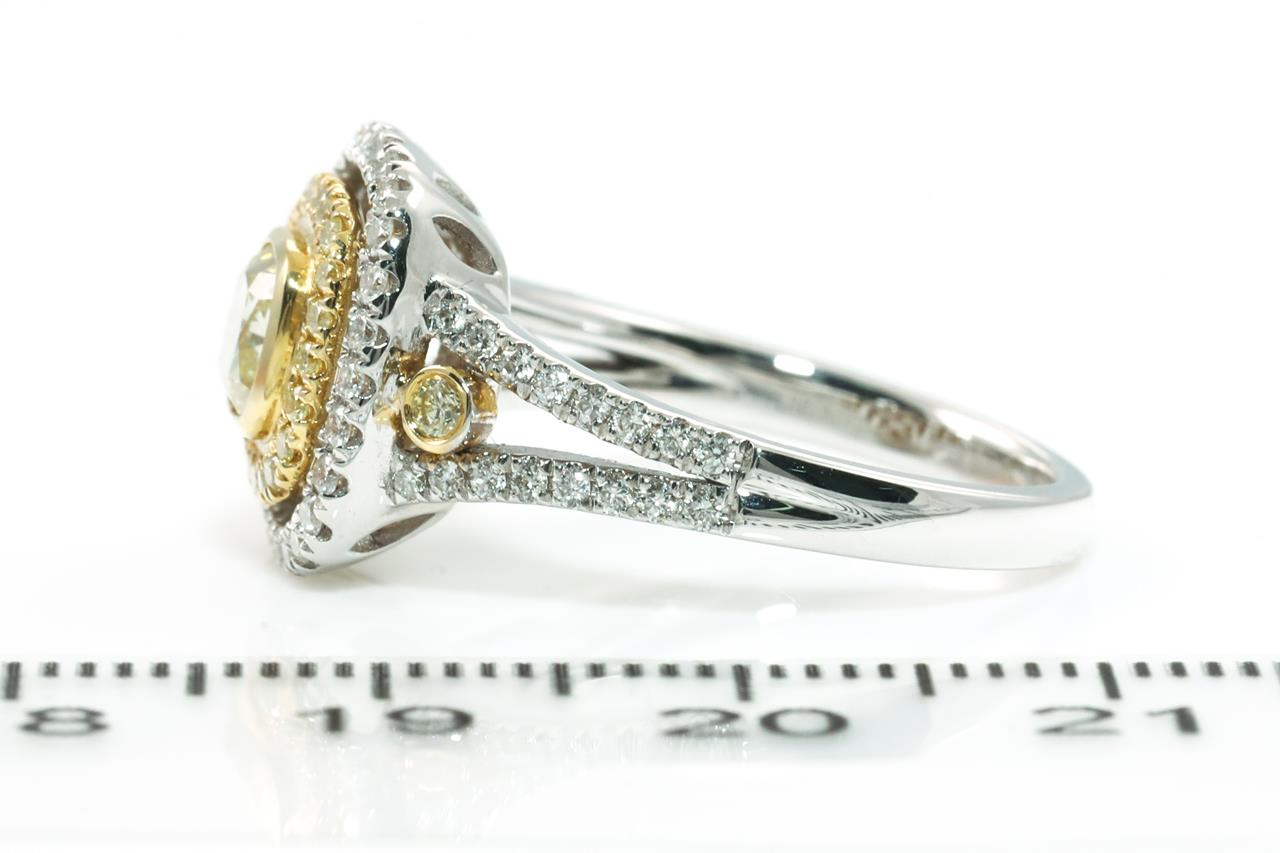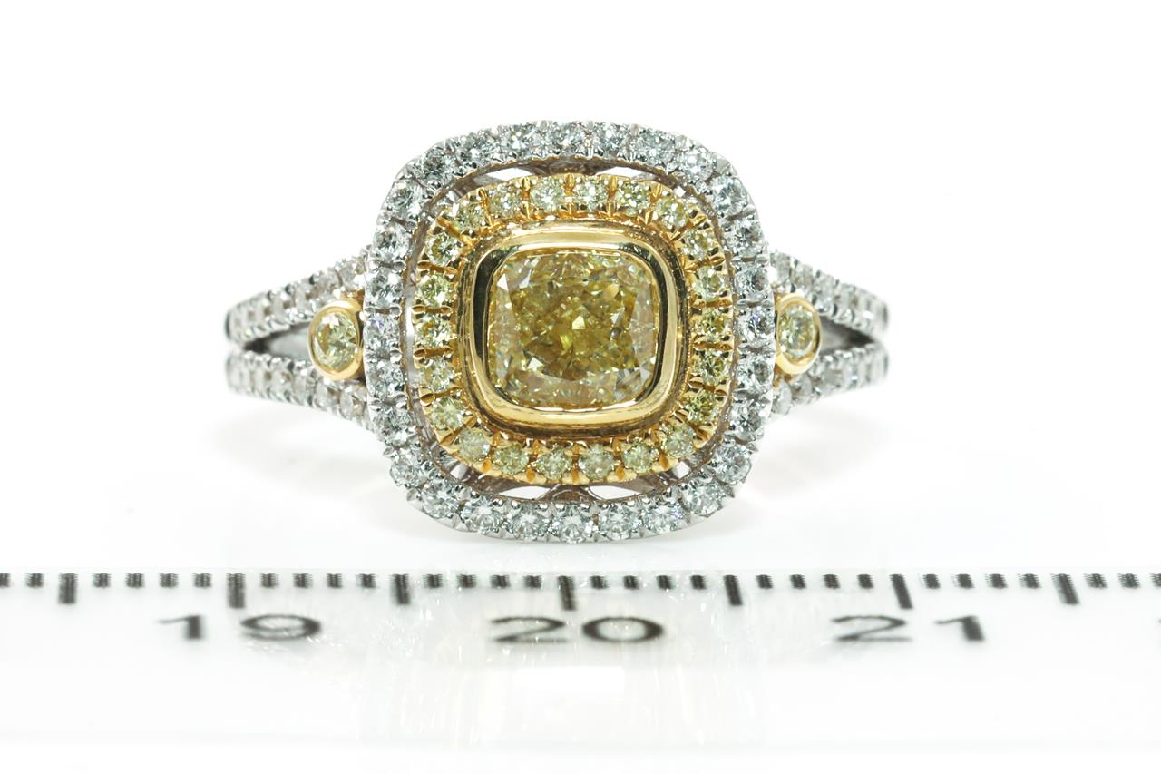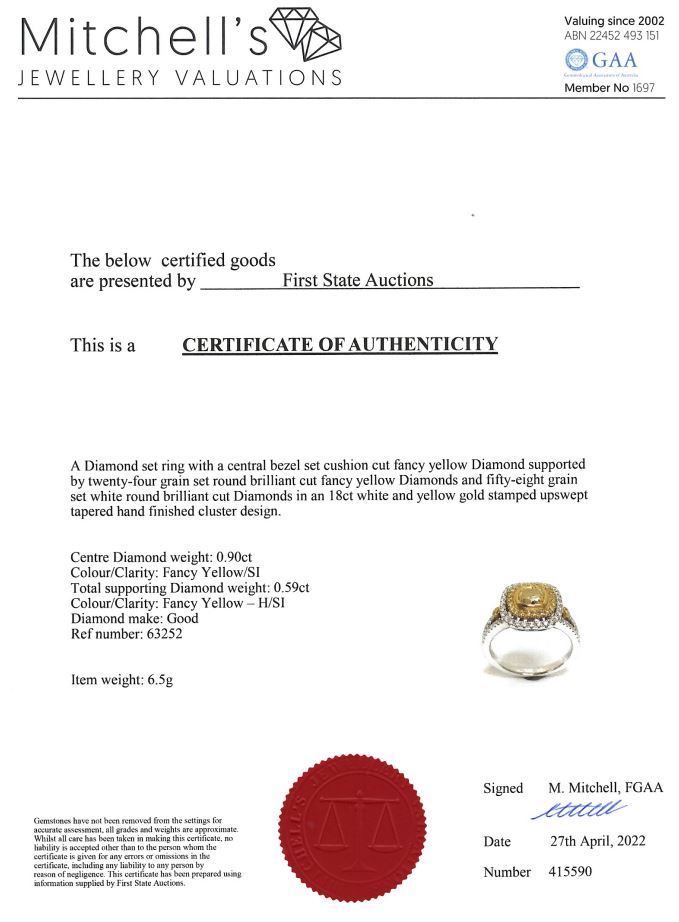 Diamond halo ring with a centre cushion cut Diamond of 0.90ct (Estimated grading: Fancy Yellow SI) and remaining yellow & white round Diamonds totalling 0.59cts (Estimated grading: Fancy Yellow - H SI). 18ct yellow & white gold. Ring size: N - ring resizing is not recommended. Weight: 6.5g. With certificate #415590. (As new)