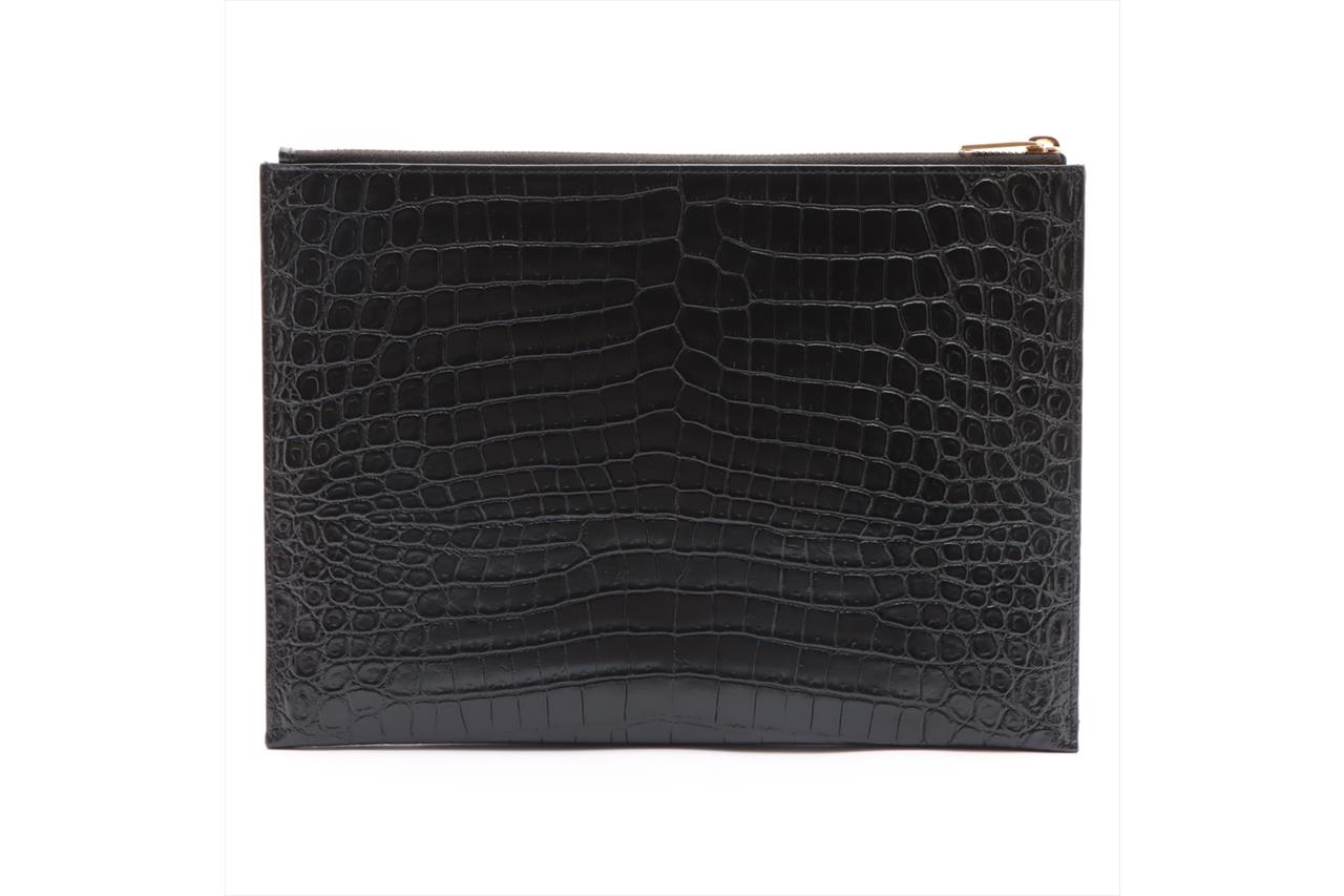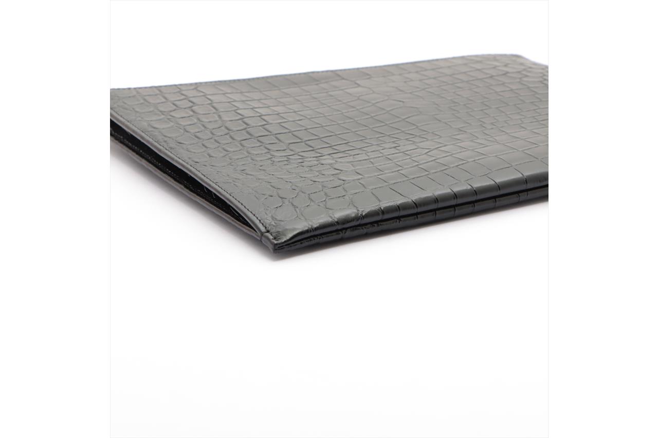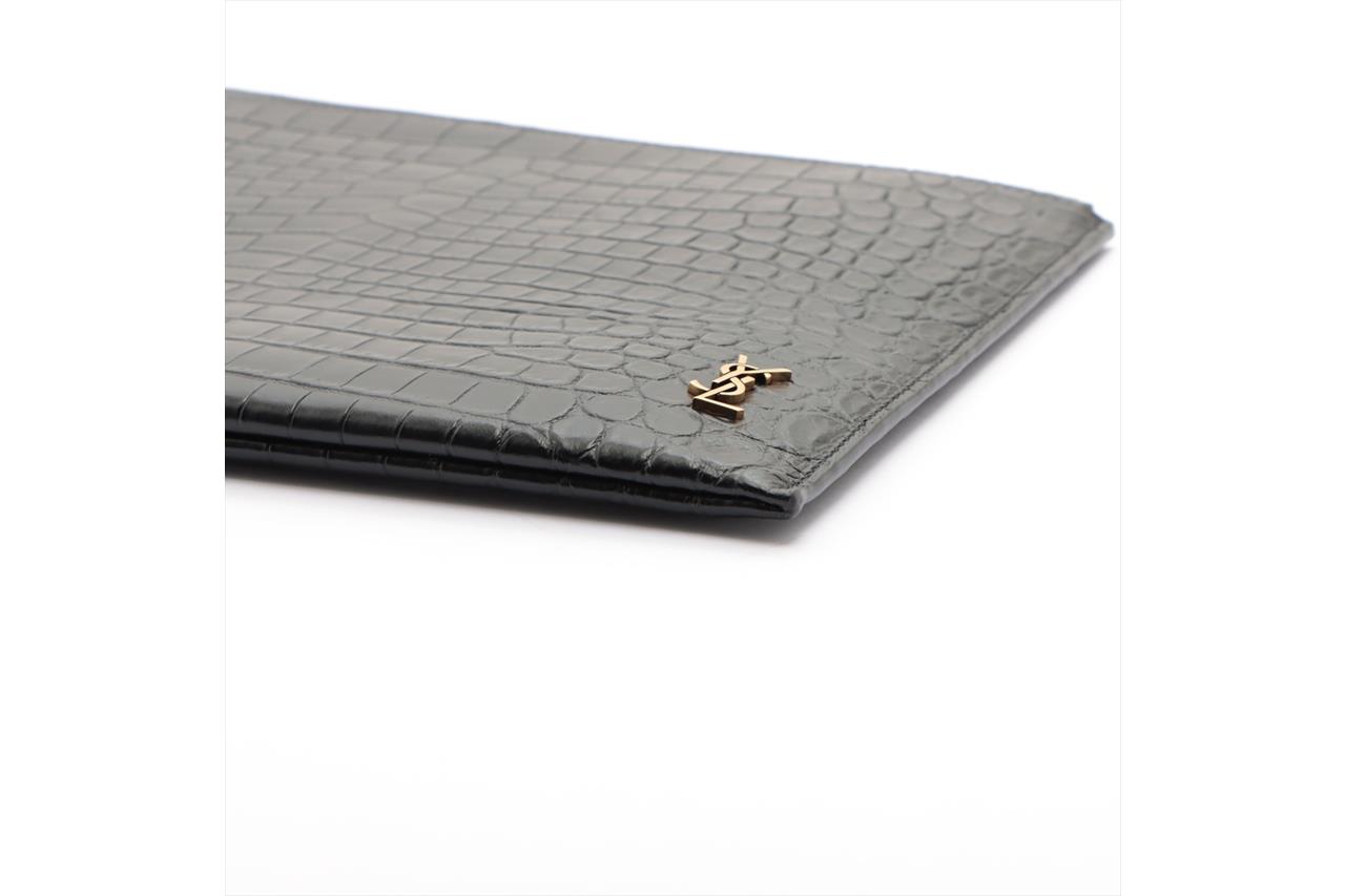 Yves Saint Laurent black Crocodile embossed lambskin leather clutch. Gold-tone hardware. Logo accent and zip-top closure. Approximate dimensions: 29cm (L) x 21cm (H) x 1.5cm (D). Made in Italy. With Yves Saint Laurent box & dust bag. With Entrupy Certificate of Authenticity. (Pre-owned)