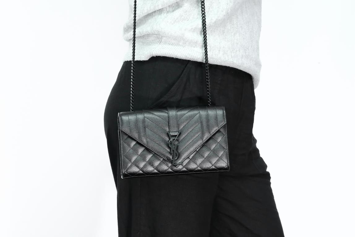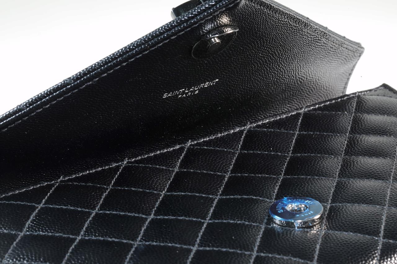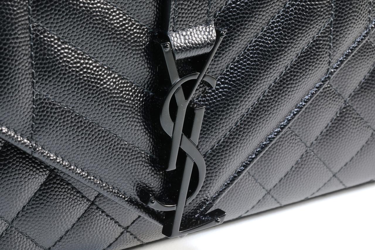 Yves Saint Laurent envelope small bag. Mix Matelasse Grain De Poudre Embossed black calfskin leather. With metal YSL initials. Dimensions 21cm x 13cm x 6m. Matte black metal hardware. Leather & chain shoulder strap. Made in Italy. With Royal Bag Spa authenticity certificate. (As new)