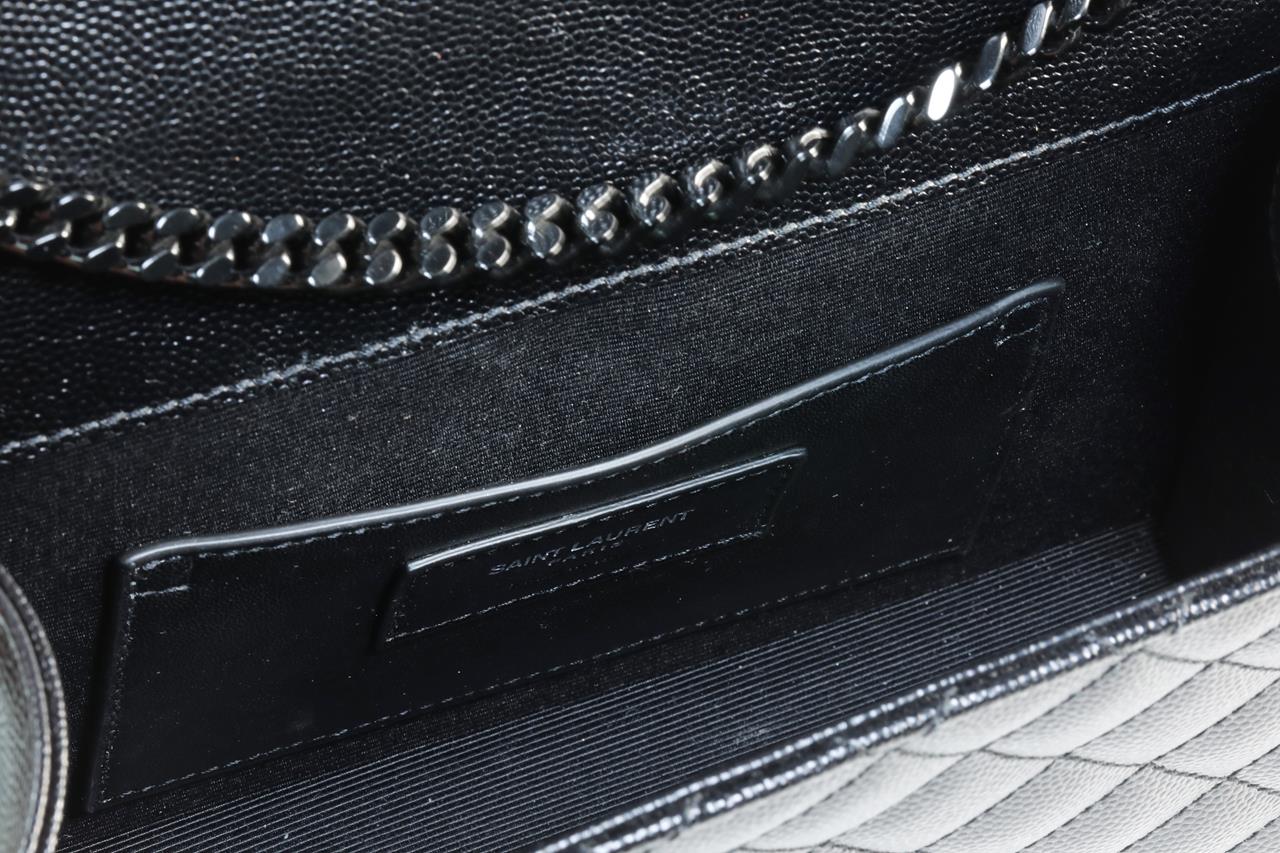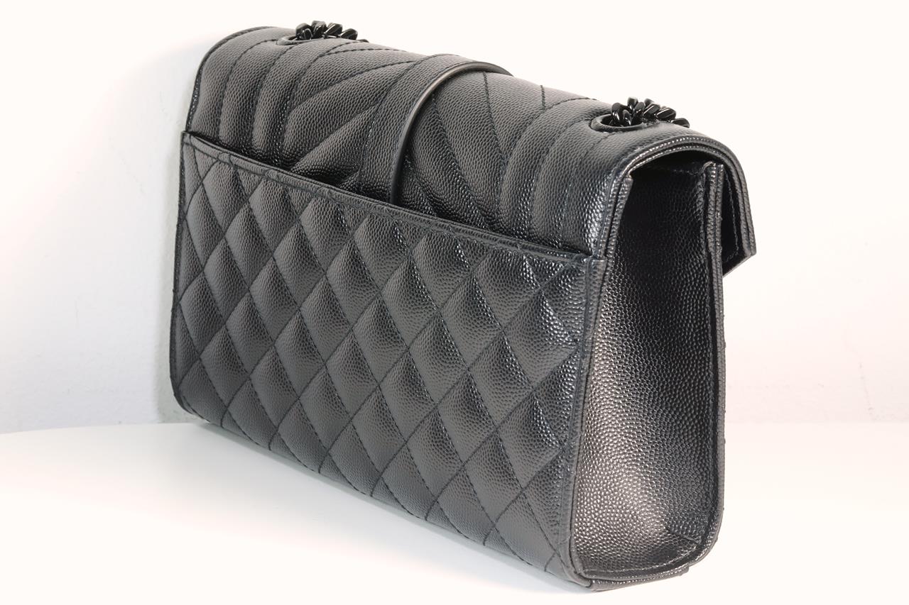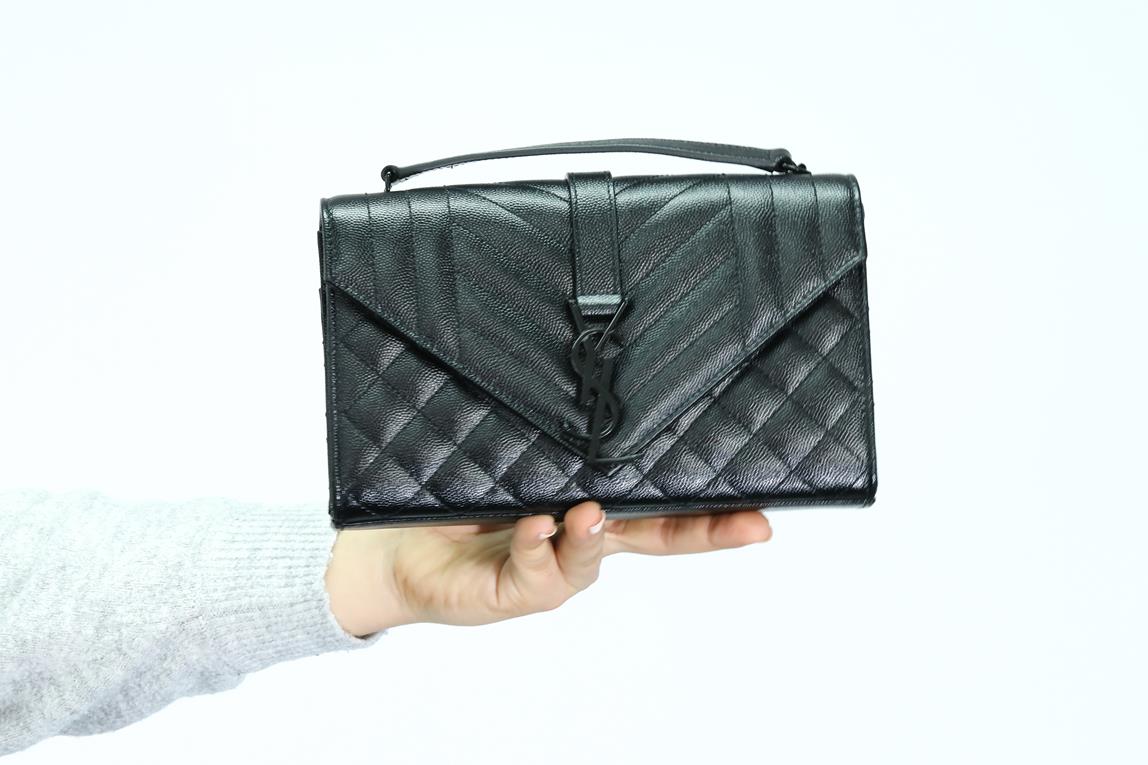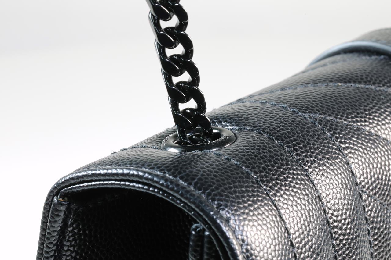 Yves Saint Laurent envelope small bag. Mix Matelasse Grain De Poudre Embossed black calfskin leather. With metal YSL initials. Dimensions 21cm x 13cm x 6m. Matte black metal hardware. Leather & chain shoulder strap. Made in Italy. With Royal Bag Spa authenticity certificate. (As new)