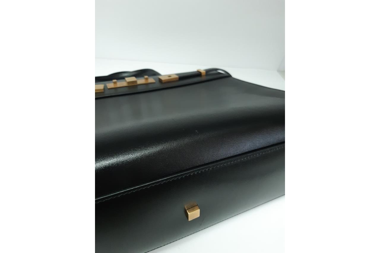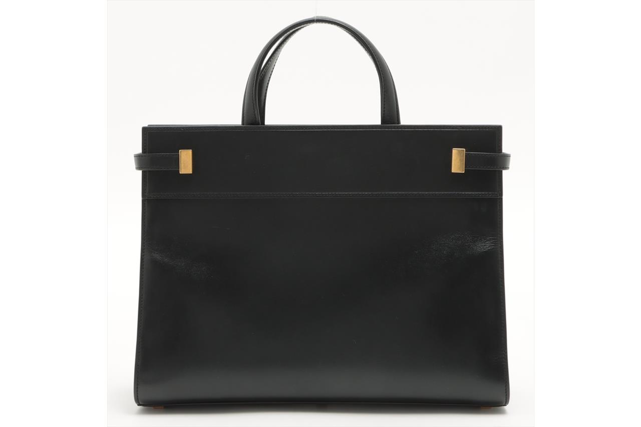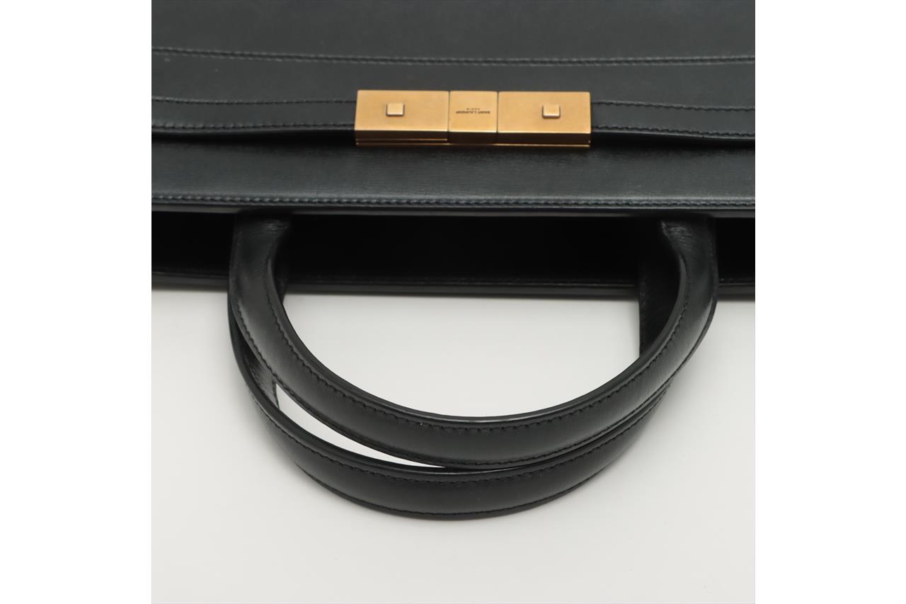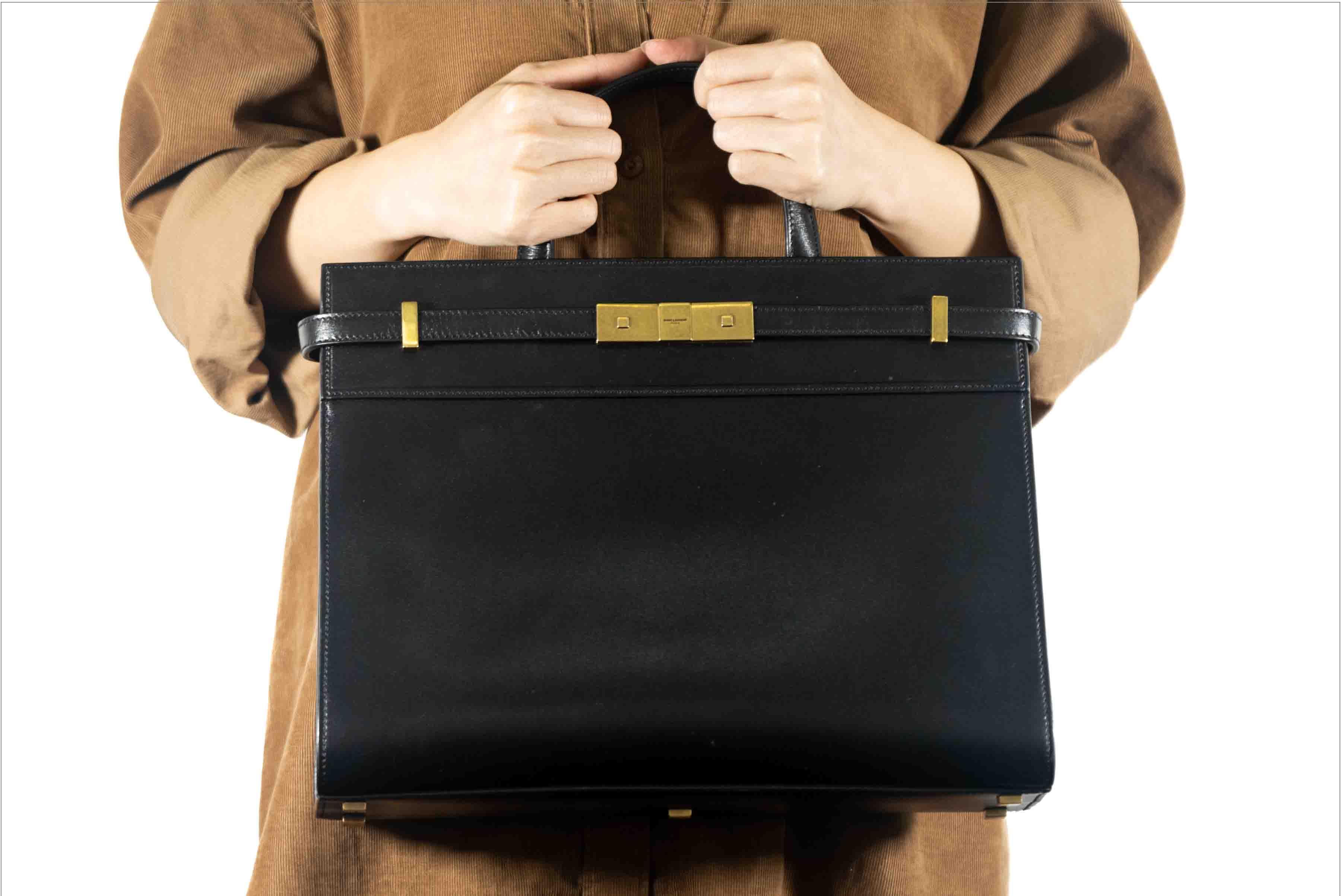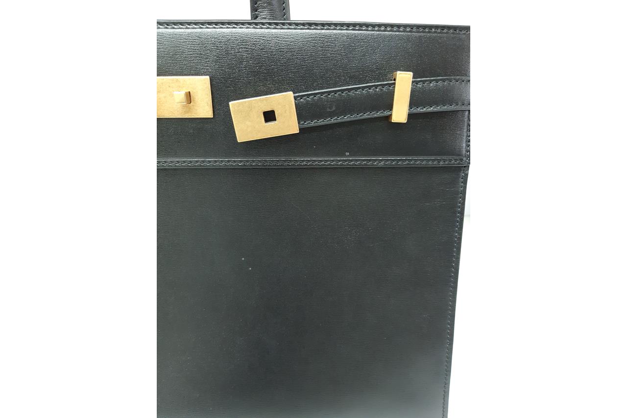 Yves Saint Laurent Manhattan small shopping bag in black calfskin leather. Featuring leather handles, gold-toned hardware, logo engraved magnetic clip buckle and compression tabs closure on front. The opens to black fabric lined interior with flat pockets. Approximate dimensions: 32cm(L) x 24cm(H) 11.5cm(D), 10cm handle drop and 48cm removable strap drop. With Entrupy Certificate of Authenticity. (Pre-owned)