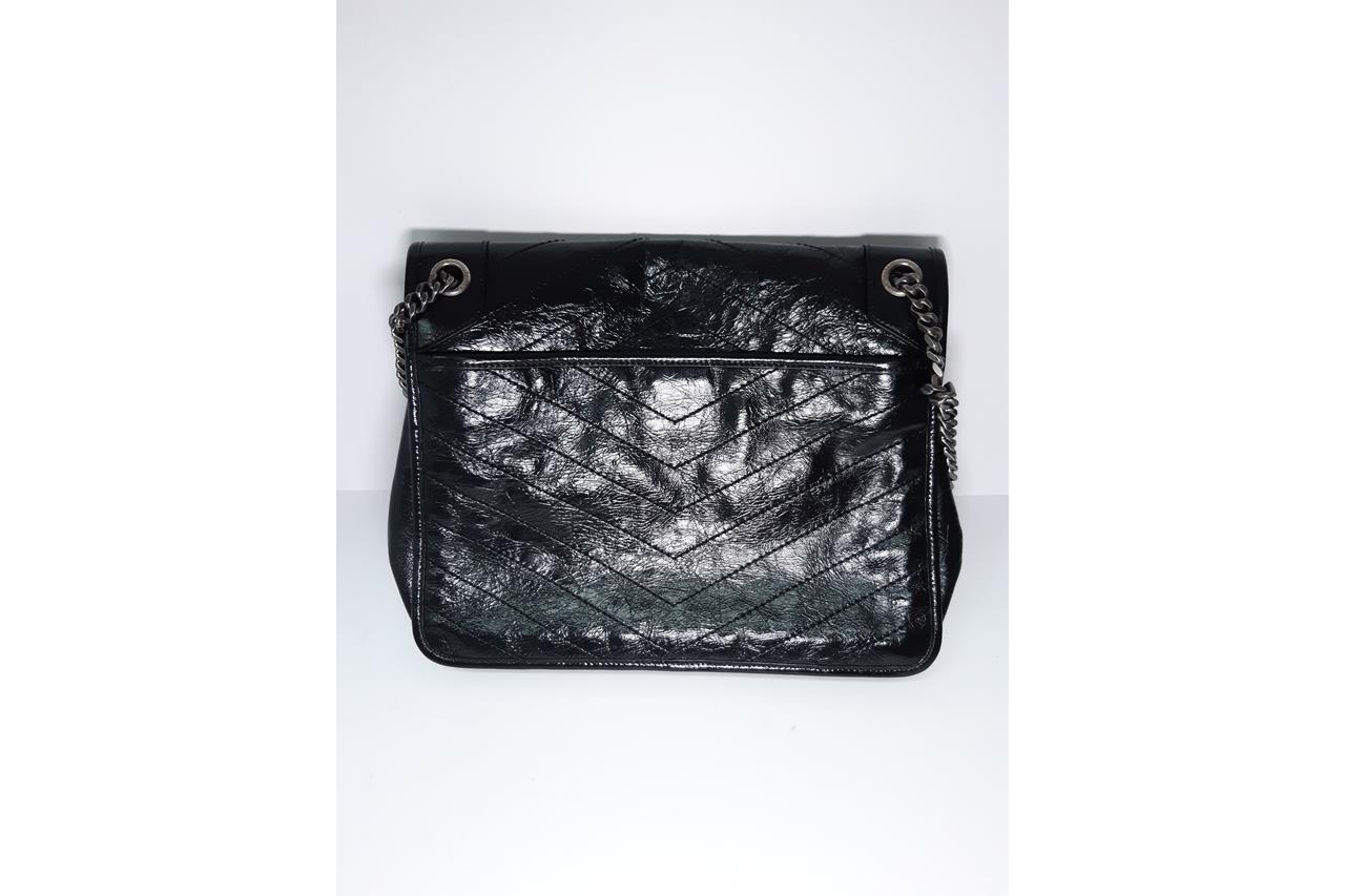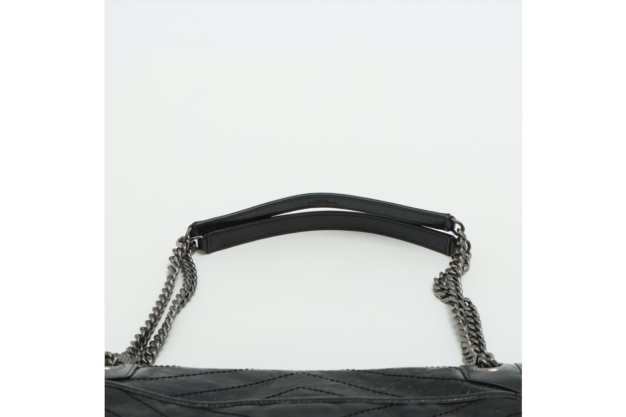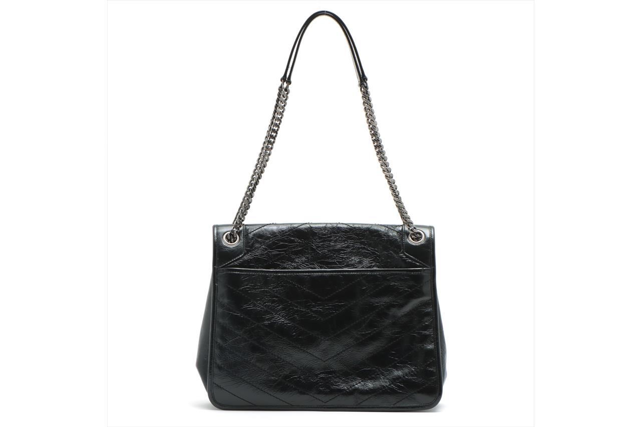 Yves Saint Laurent Niki large chain bag in crinkly black calfskin leather. Featuring chevron quilting, metal-tone hardware, two external pockets under flap and at rear, front flap with YSL logo and magnetic closure. It opens to fabric lining interior with zipped and patch pockets. Approximate dimensions: 32cm(L) x 24.5cm(H) x 8.5cm(D) and 29cm double chain drop. Accompanied by YSL info booklets and dust bag. With Entrupy Certificate of Authenticity. (Pre-owned)