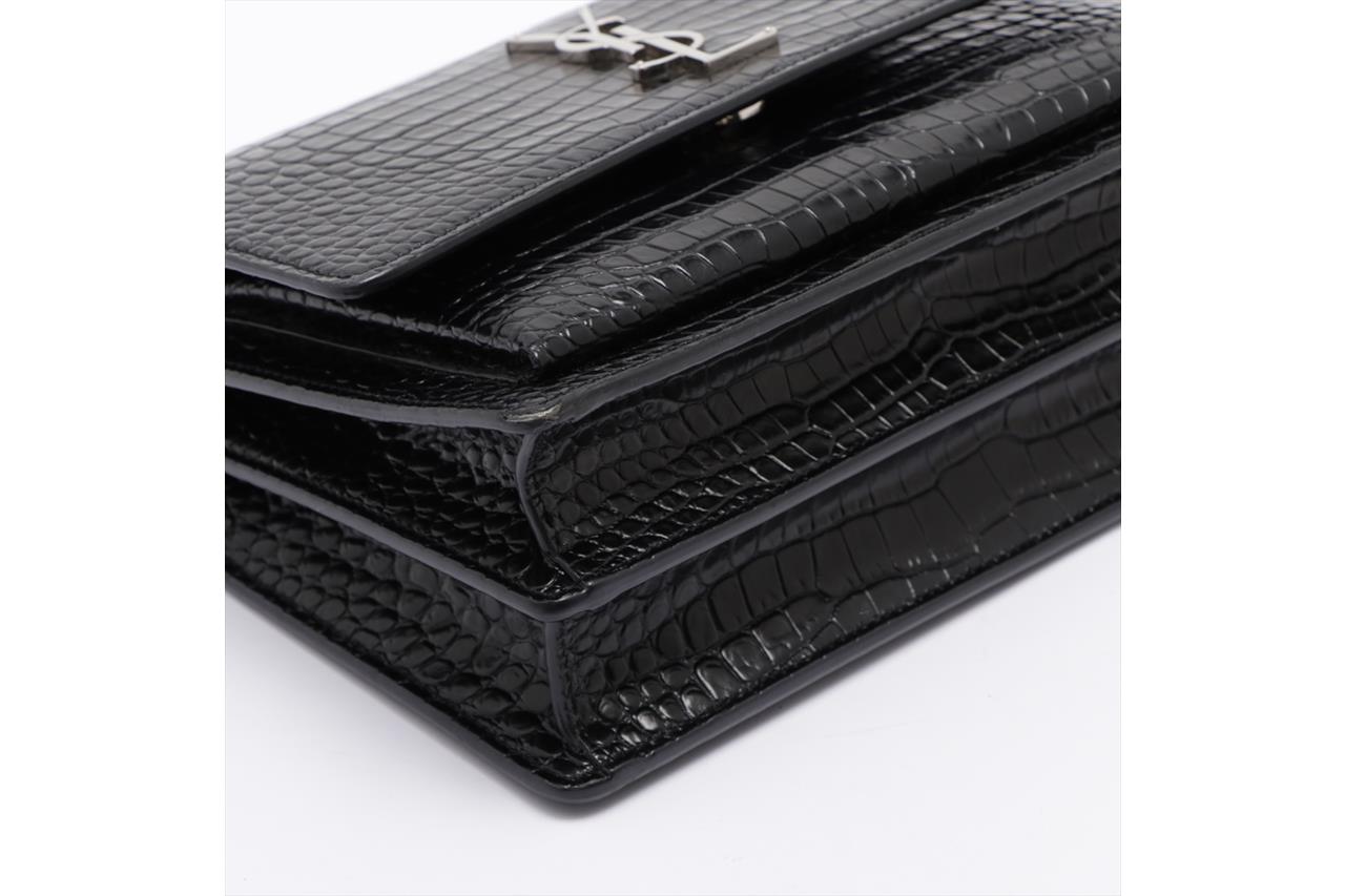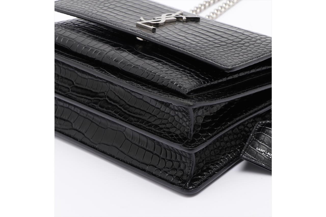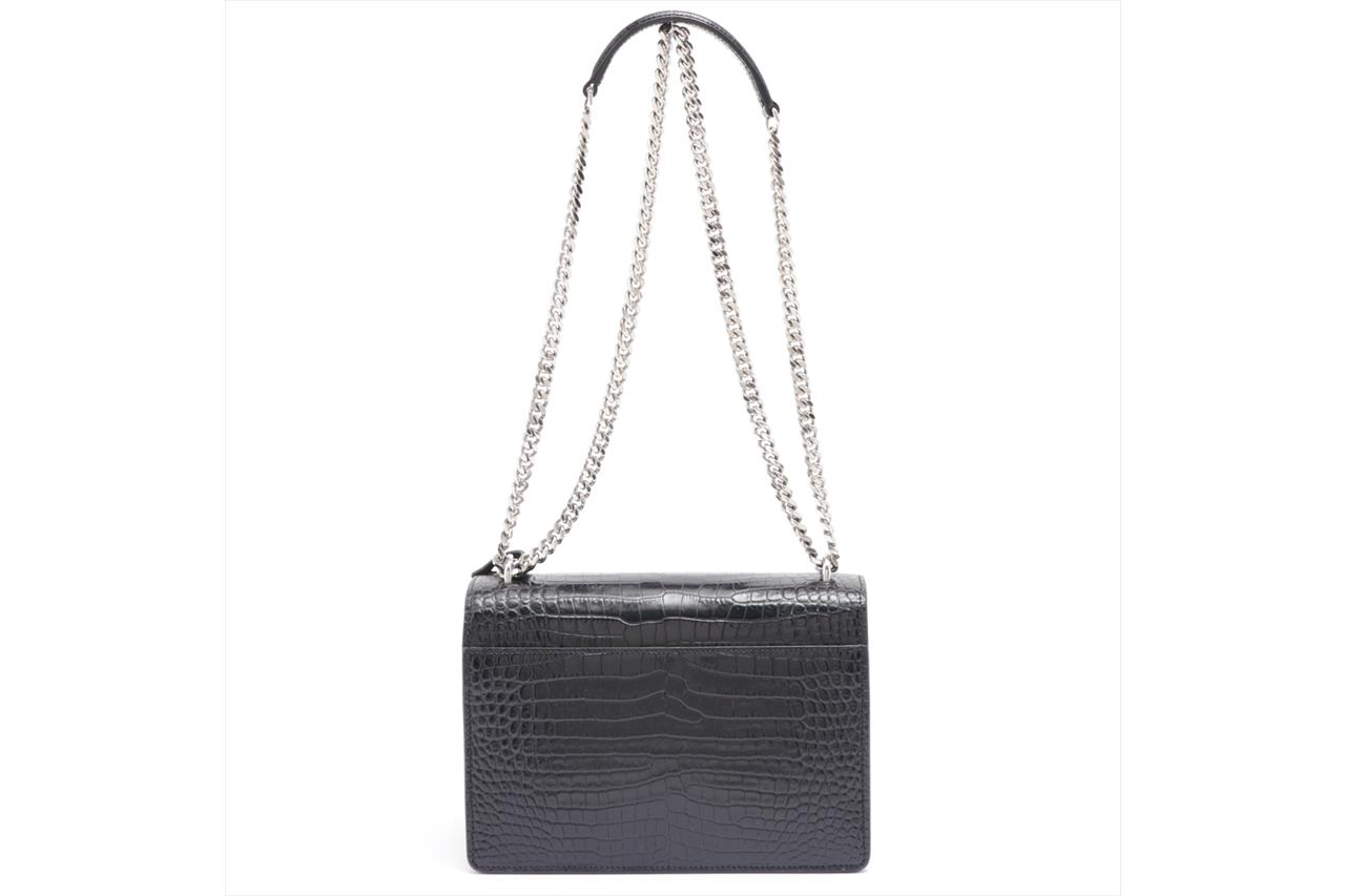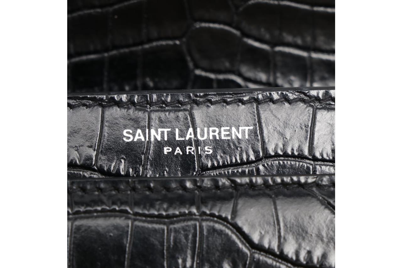 Yves Saint Laurent Sunset Medium Monogram Bag. Black, mock croc, embossed calfskin leather. Silver-tone hardware. Approximate dimensions: 22cm (L) x 16cm (H) x 8cm (D) and 51cm shoulder strap. Made in Italy. With YSL dust bag and Entrupy Certificate of Authenticity. (Pre-owned)