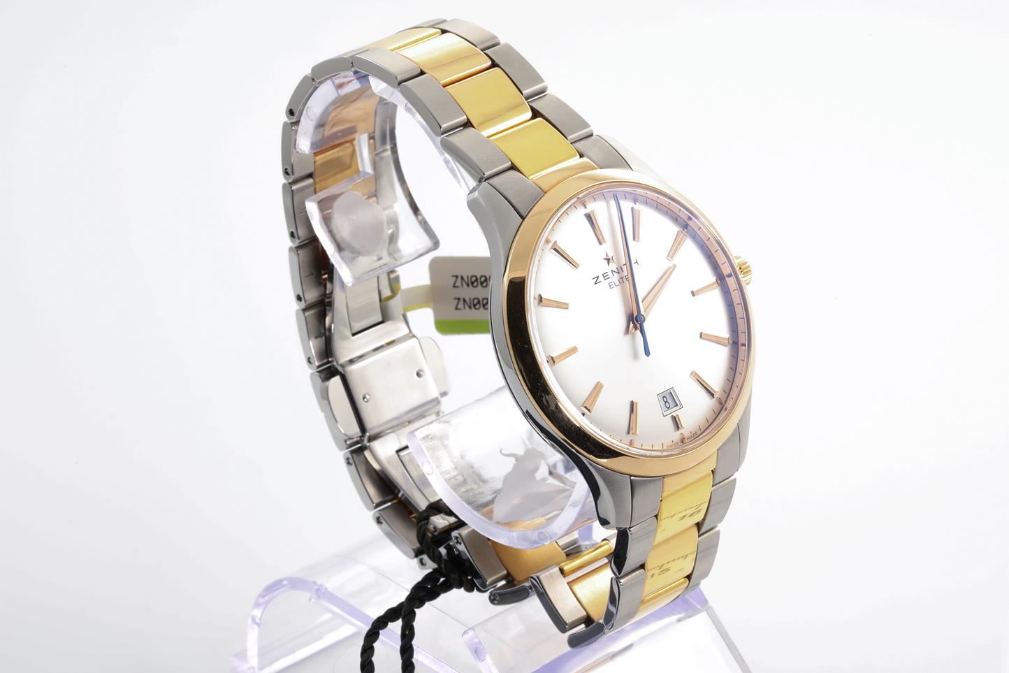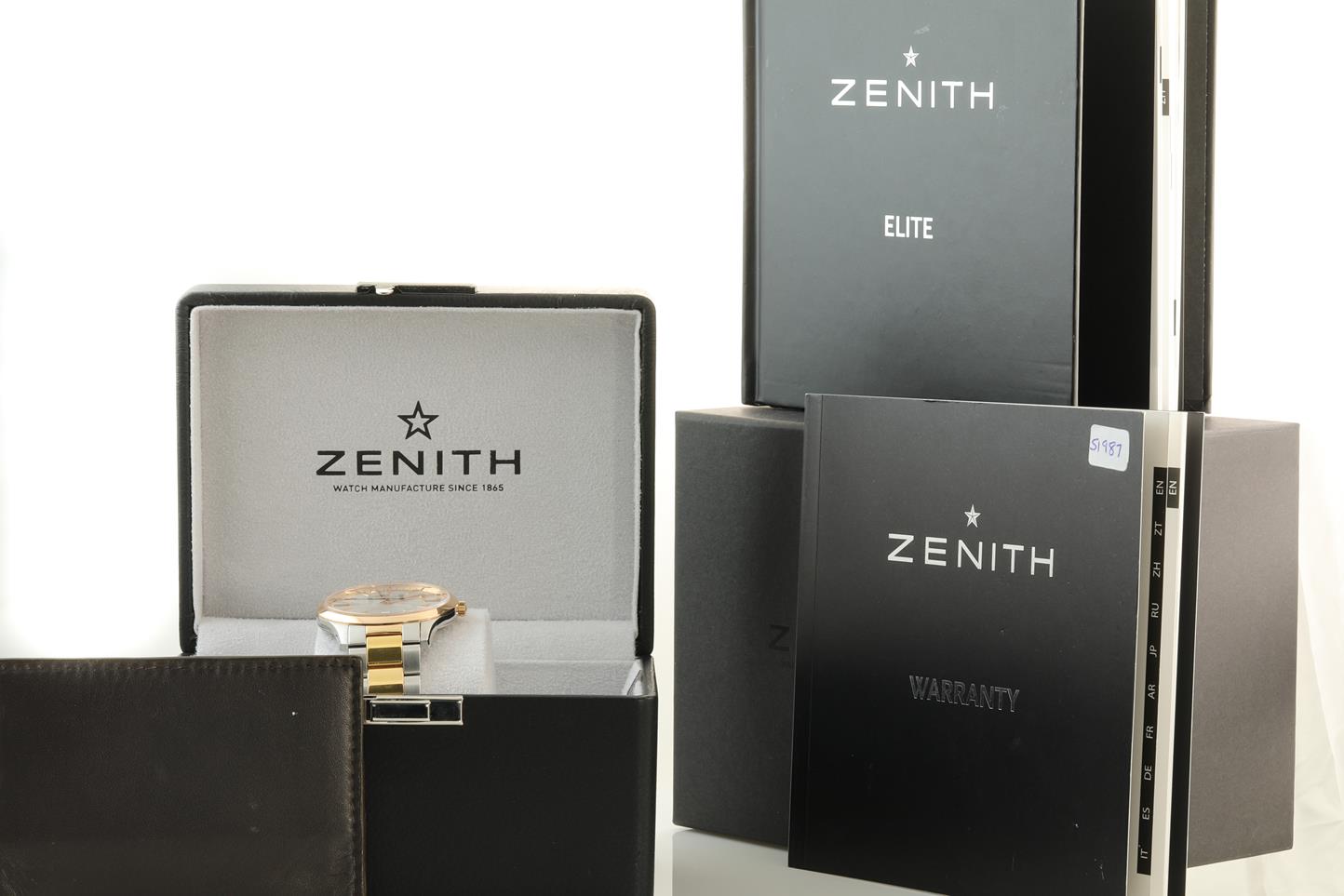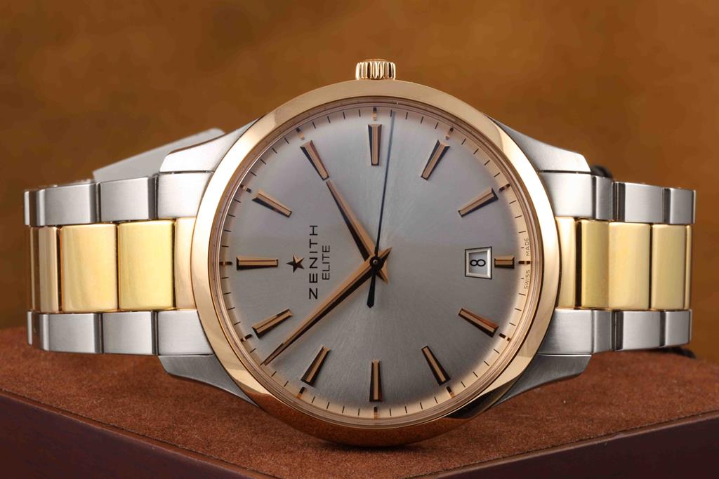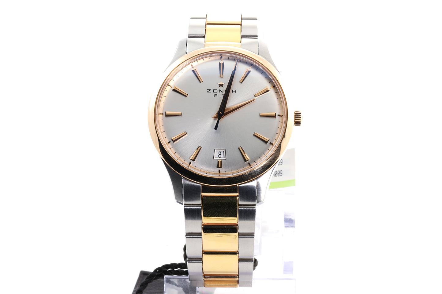 Zenith Captain Central Second 18ct rose gold and stainless steel automatic mens watch. Silver dial, date, case diameter: 40mm, Swiss made. Ref# 51.2020.670/01M2020. With Zenith two-tone bracelet and clasp. With Zenith international warranty card (not stamped) and instruction manual and Zenith box. 3 month FSA warranty (New)