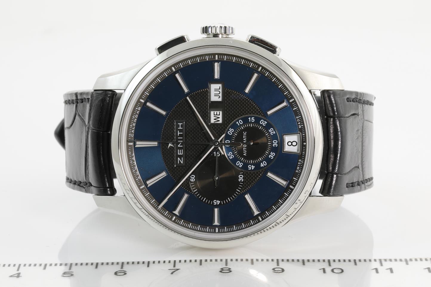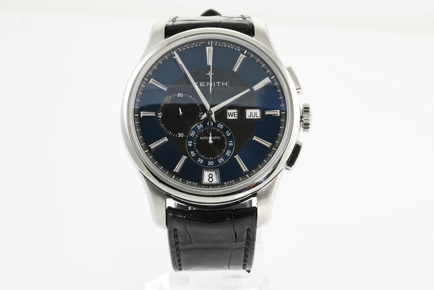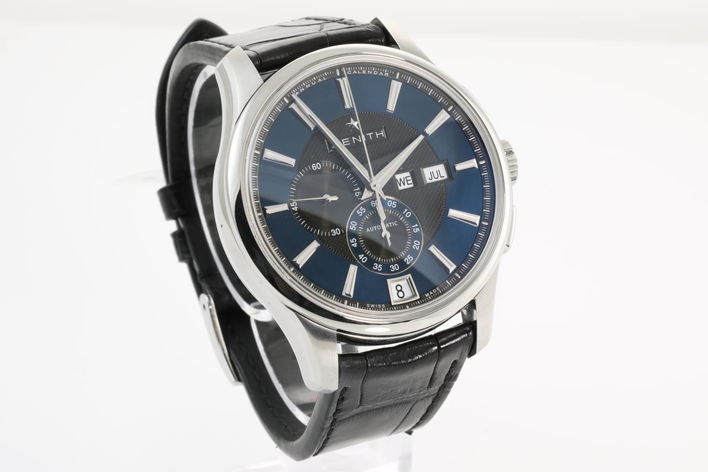 Zenith Captain Winsor stainless steel automatic mens watch. Blue dial with black guilloché center dial, month, day & date, case diameter: 42mm, Swiss made. Ref #03.2070.4054/22.C708. With Zenith black leather strap and clasp. Note: slight wear on strap due to being display stock. With Zenith international warranty card (not stamped) and instruction manual inside Zenith box. 3 month FSA warranty. (New)