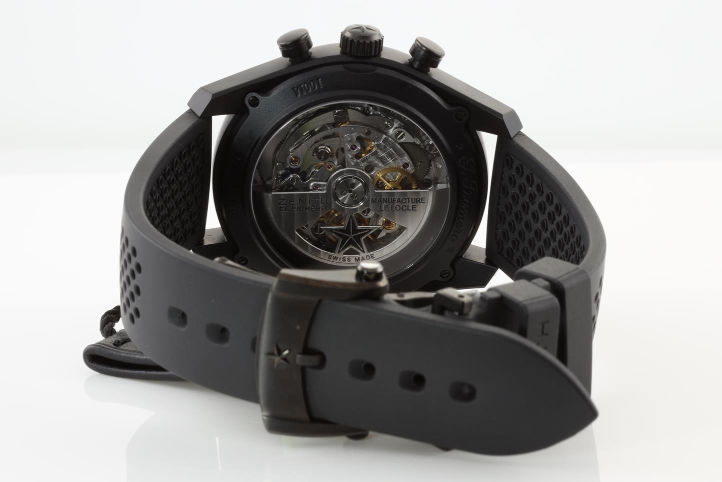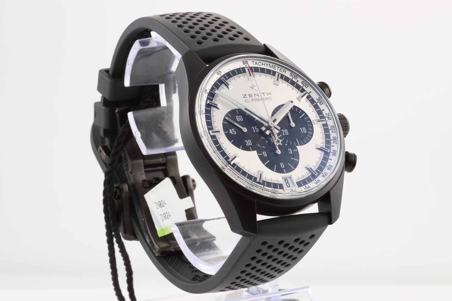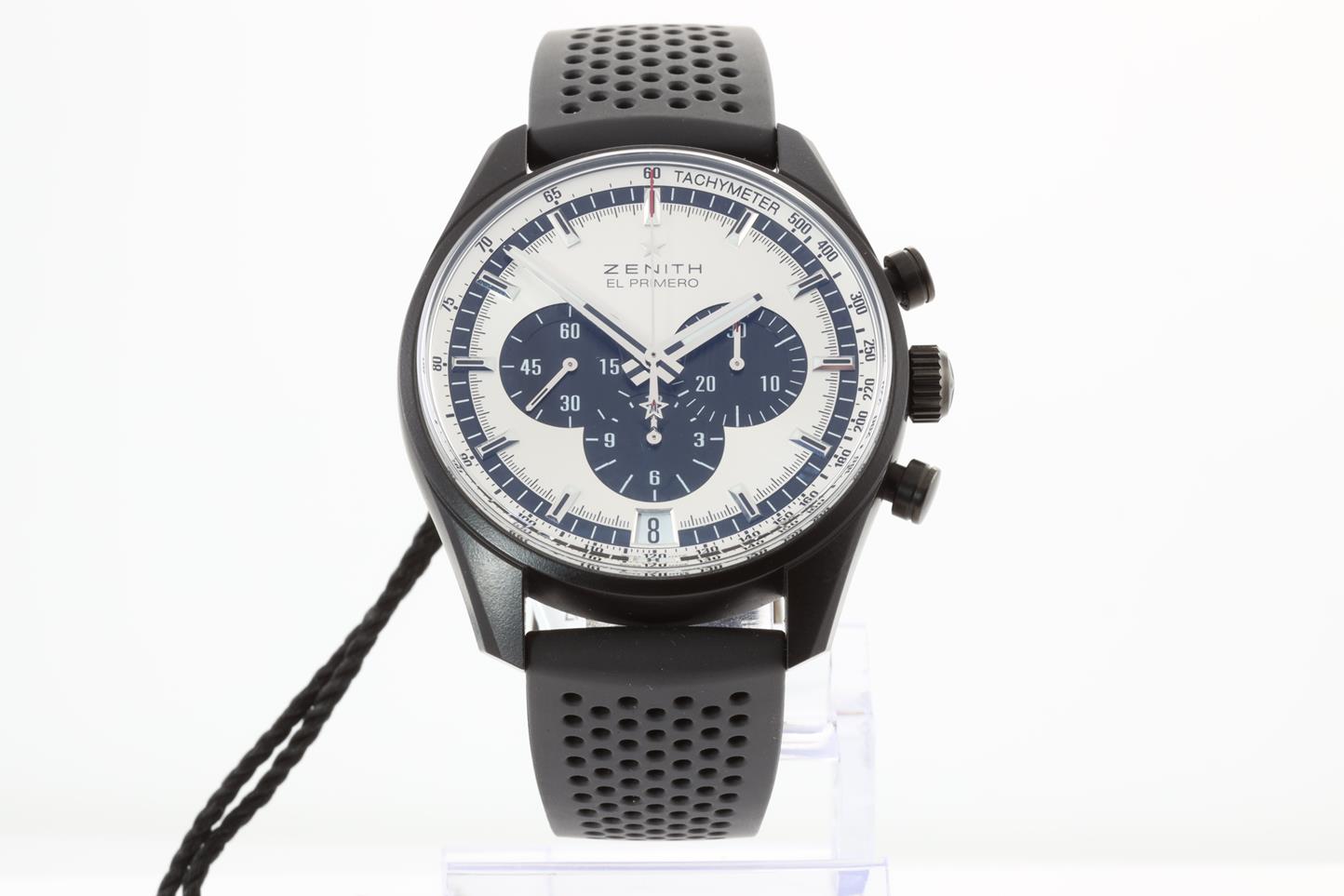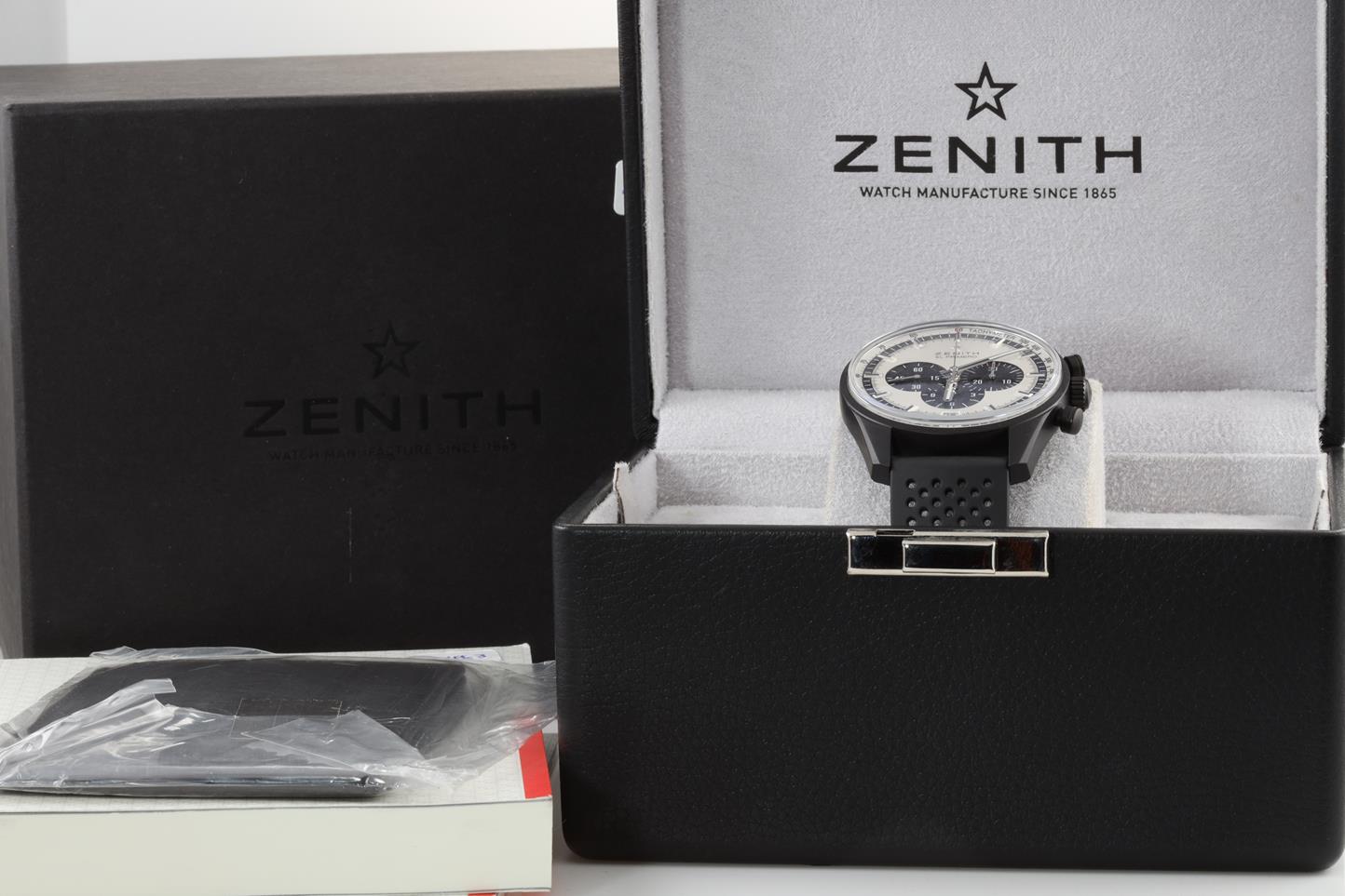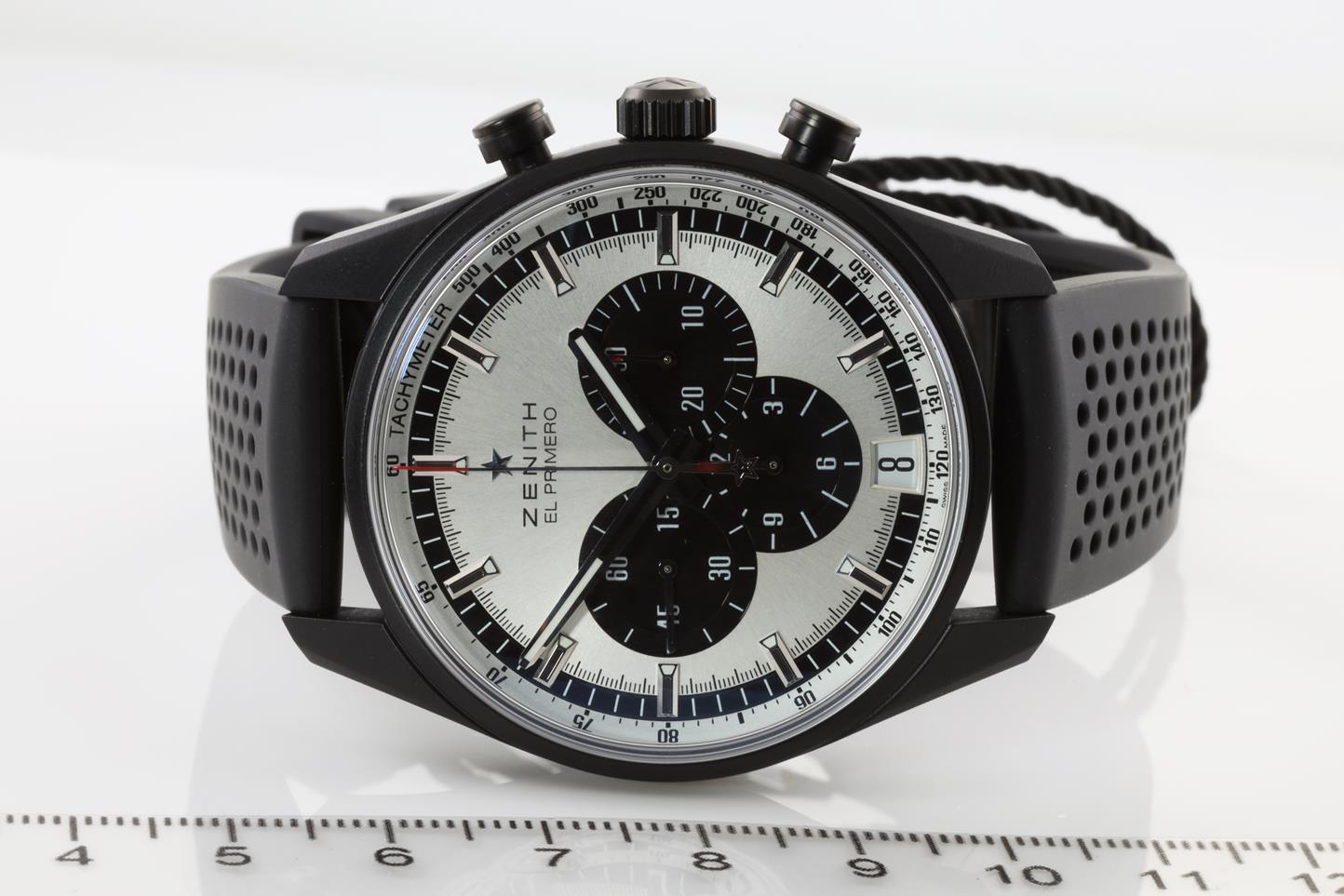 Zenith Chronomaster El Primero aluminum with black ceramic finish automatic mens watch. Silver chronograph dial, date, case diameter: 42mm, Swiss made. Ref #24.2041.400/01.R576. With Zenith black rubber strap and clasp. With Zenith international warranty card (not stamped) and qiuck-step guide inside Zenith worn box. 3 motnh FSA warranty. (New)