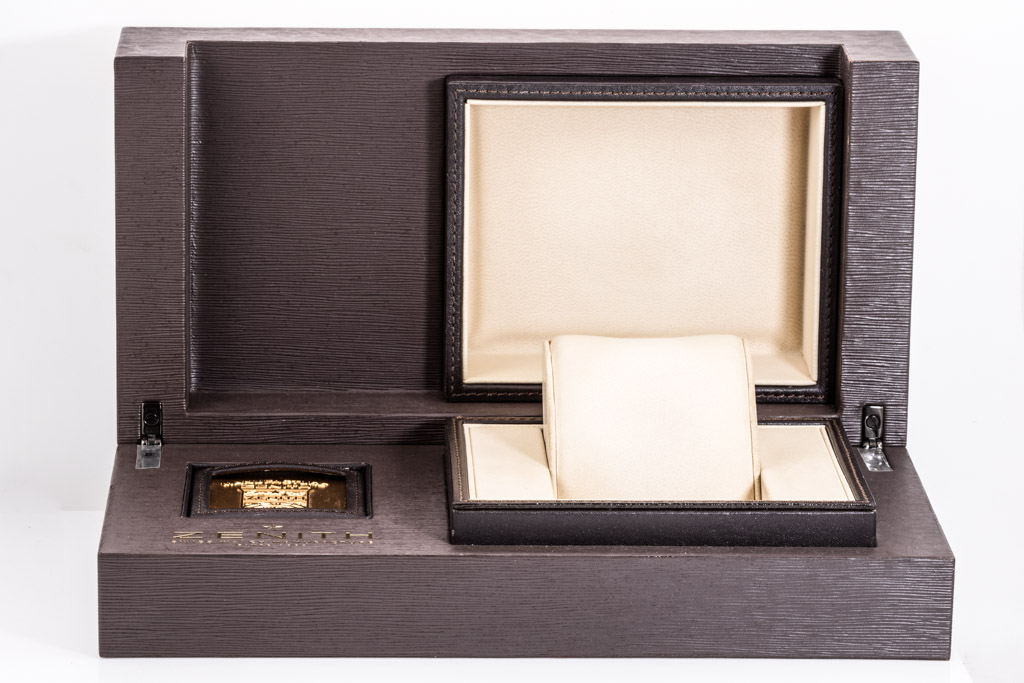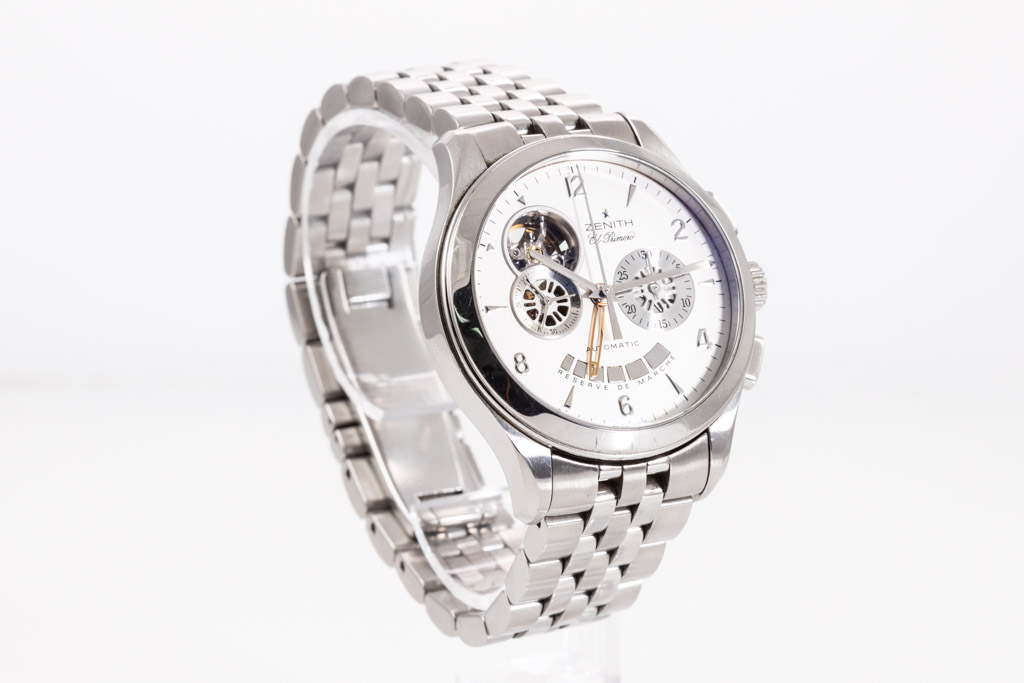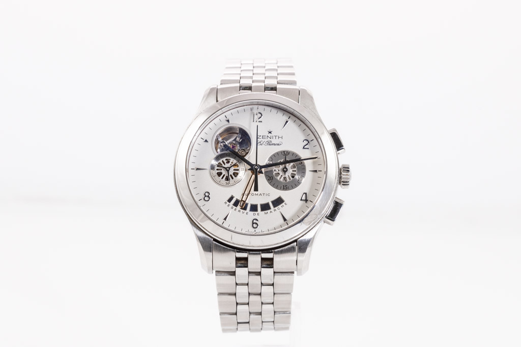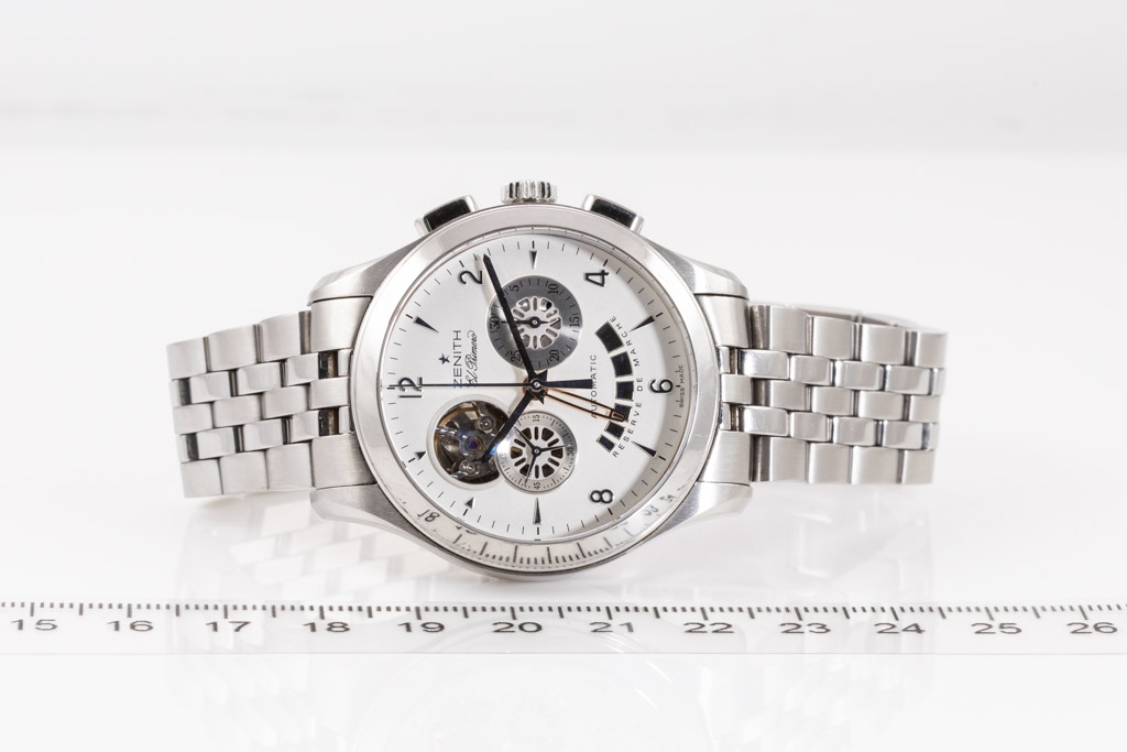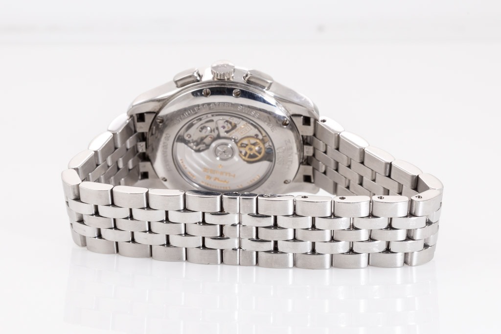 Zenith Class El Primero stainless steel automatic men's watch. Silver Chronograph dial, case diameter: 40mm, wrist size: 19cm, Swiss made. Ref# 03.0510.4021. With Zenith stainless steel bracelet and clasp. With Certificate of Authenticity, Zenith International Card and Zenith box. 3 month FSA warranty. (Pre-owned)