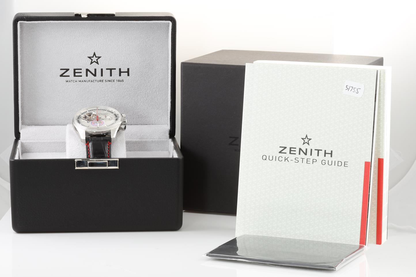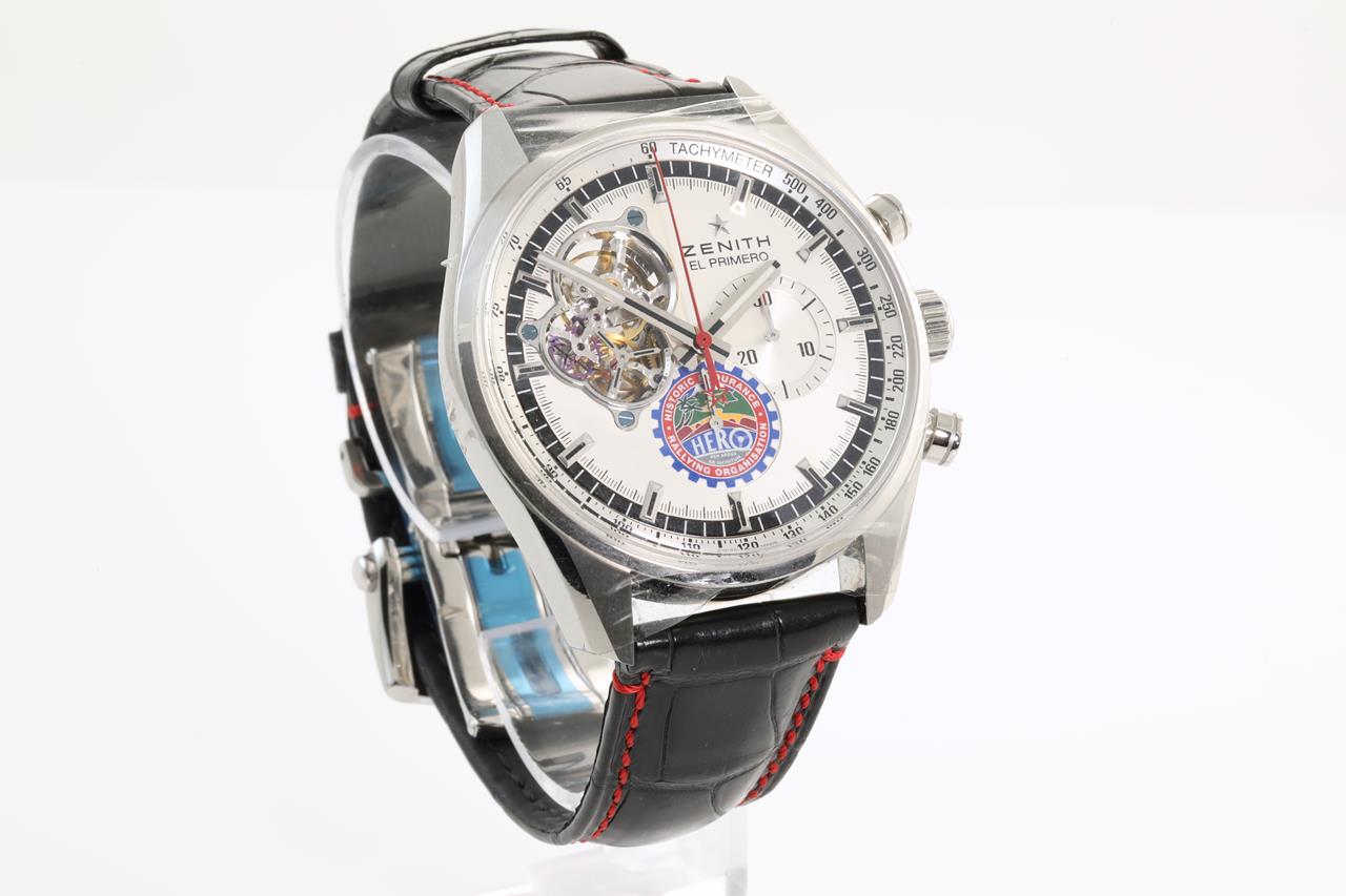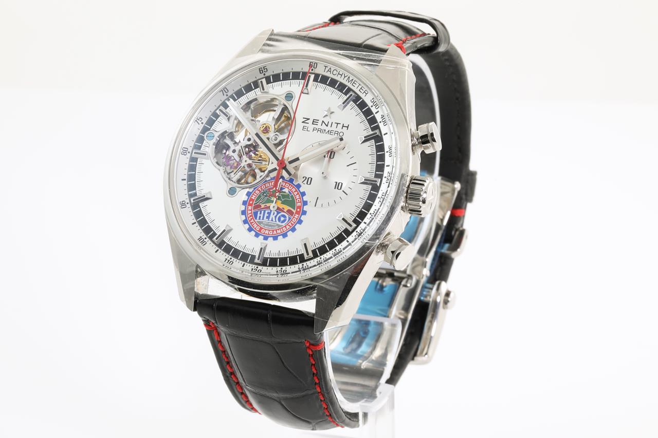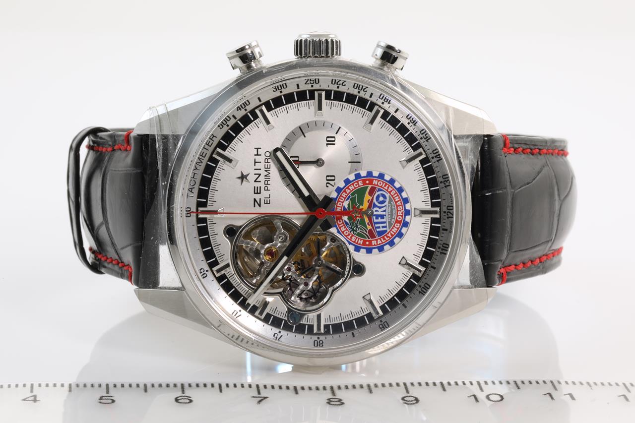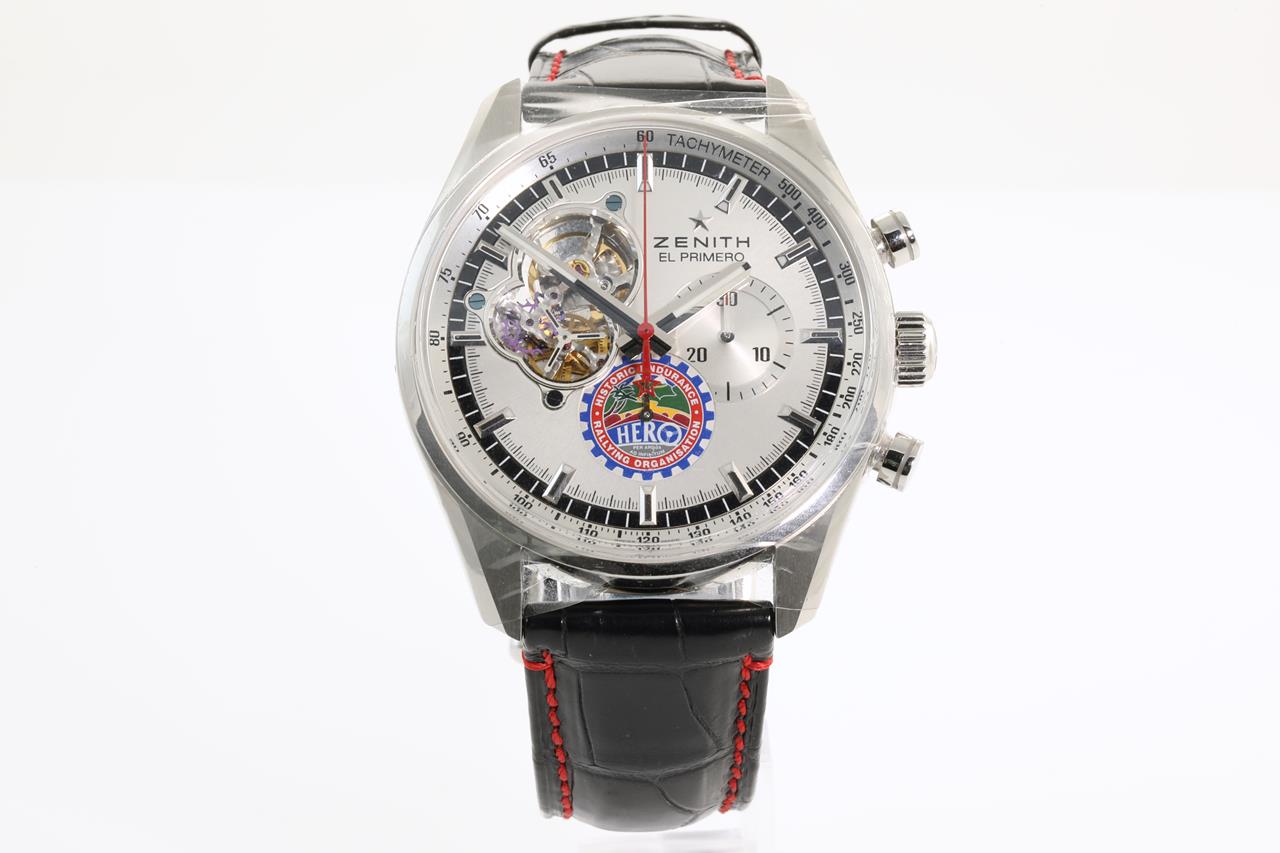 Zenith El Primero Chronomaster 1969 Hero Cup limited edition stainless steel automatic mens watch. Silver cutaway dial, case diameter: 42mm, Swiss made. Ref #03.20410.4061/07.C77, limited edition of 100. With Zenith black leather strap and clasp. With Zenith international warranty card (not stamped) and quick-step guide booklet inside Zenith box. 3 month FSA warranty. (New, in original wrapping)