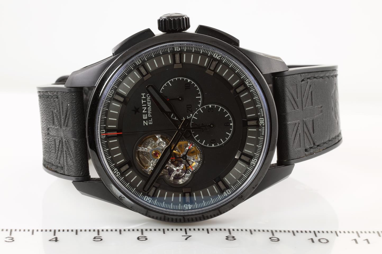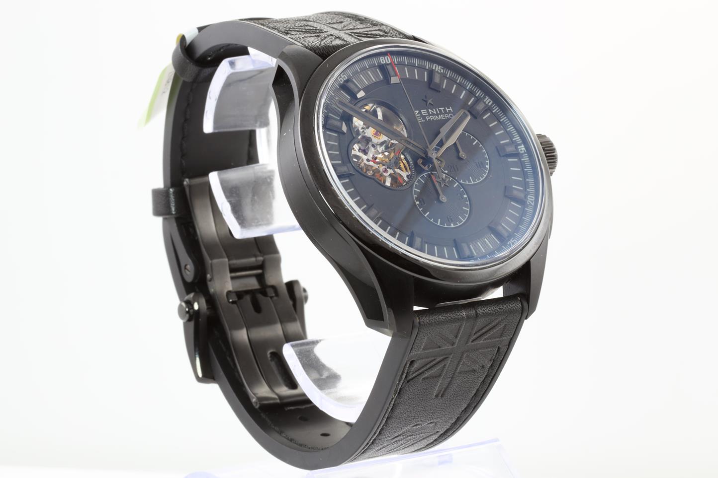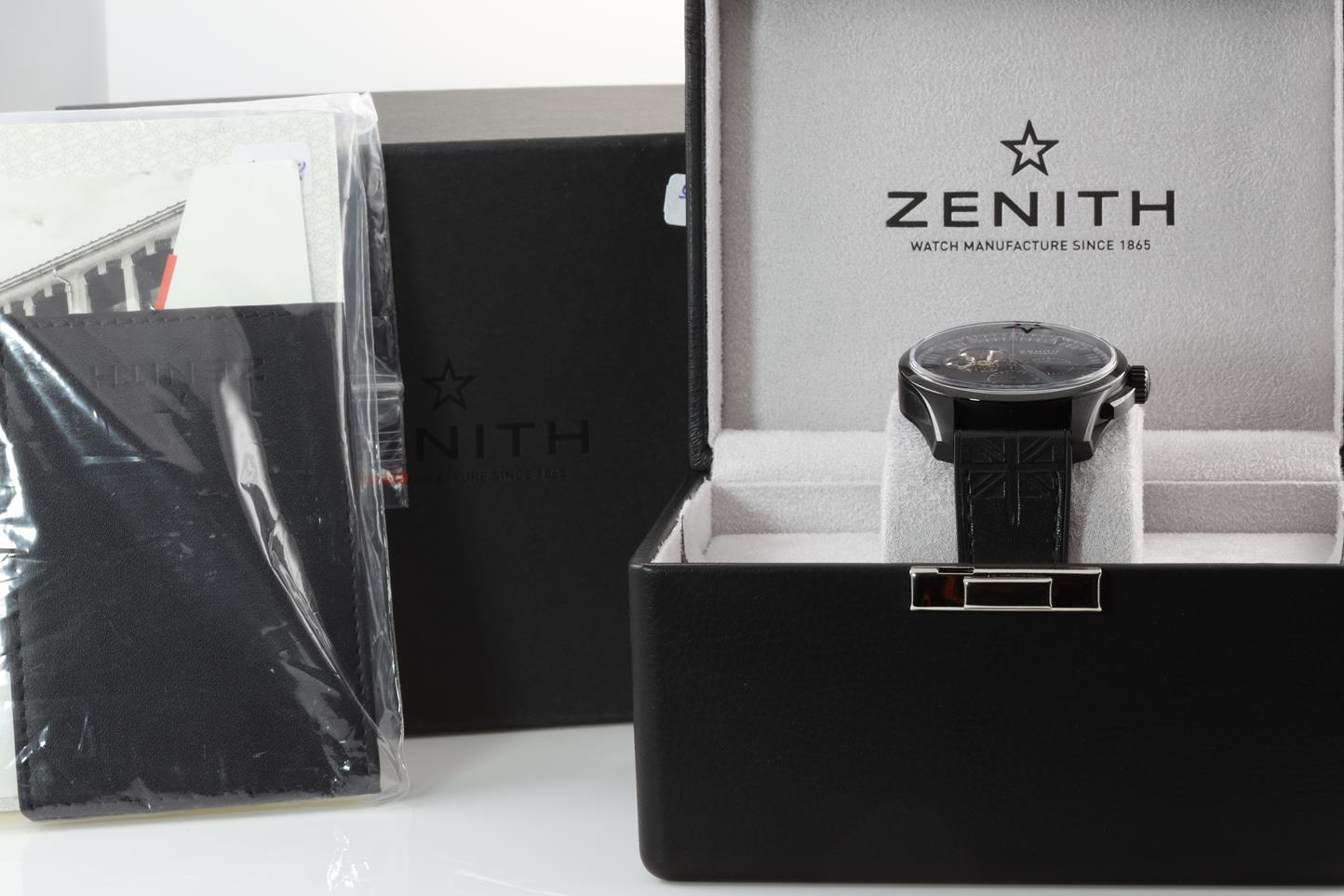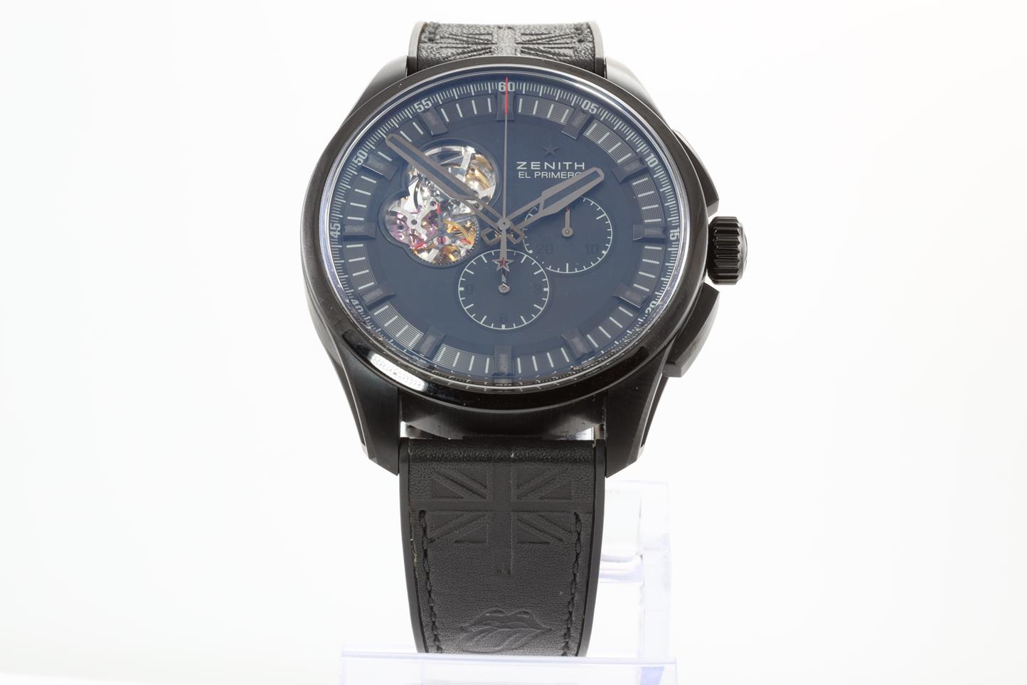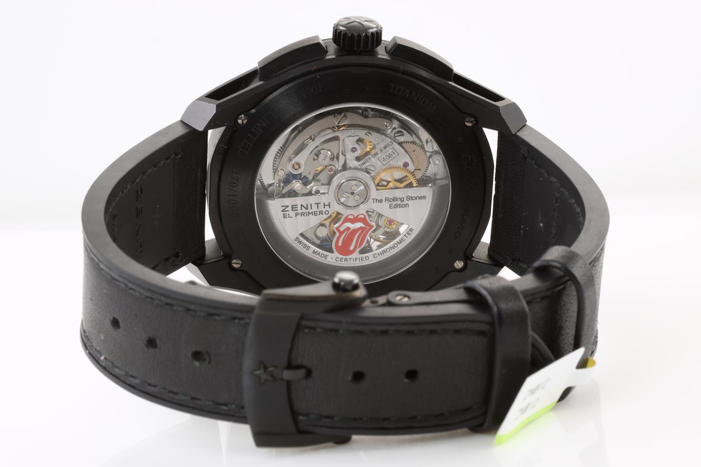 Zenith El Primero Chronomaster Rolling Stones limited edition black DLC coating titanium automatic mens watch. Black dial, case diameter: 45mm, Swiss made. Ref #96.2260.4061/21.R575, limited edition of 1000. With Zenith black rubber strap adorned with a UNION JACK flag and clasp. With Zenith international warranty card (not stamped) and instruction manual inside Zenith box. 3 month FSA warranty. (New)