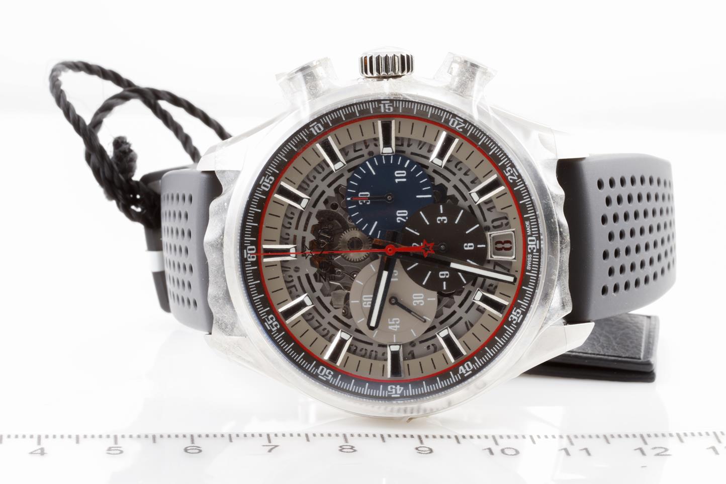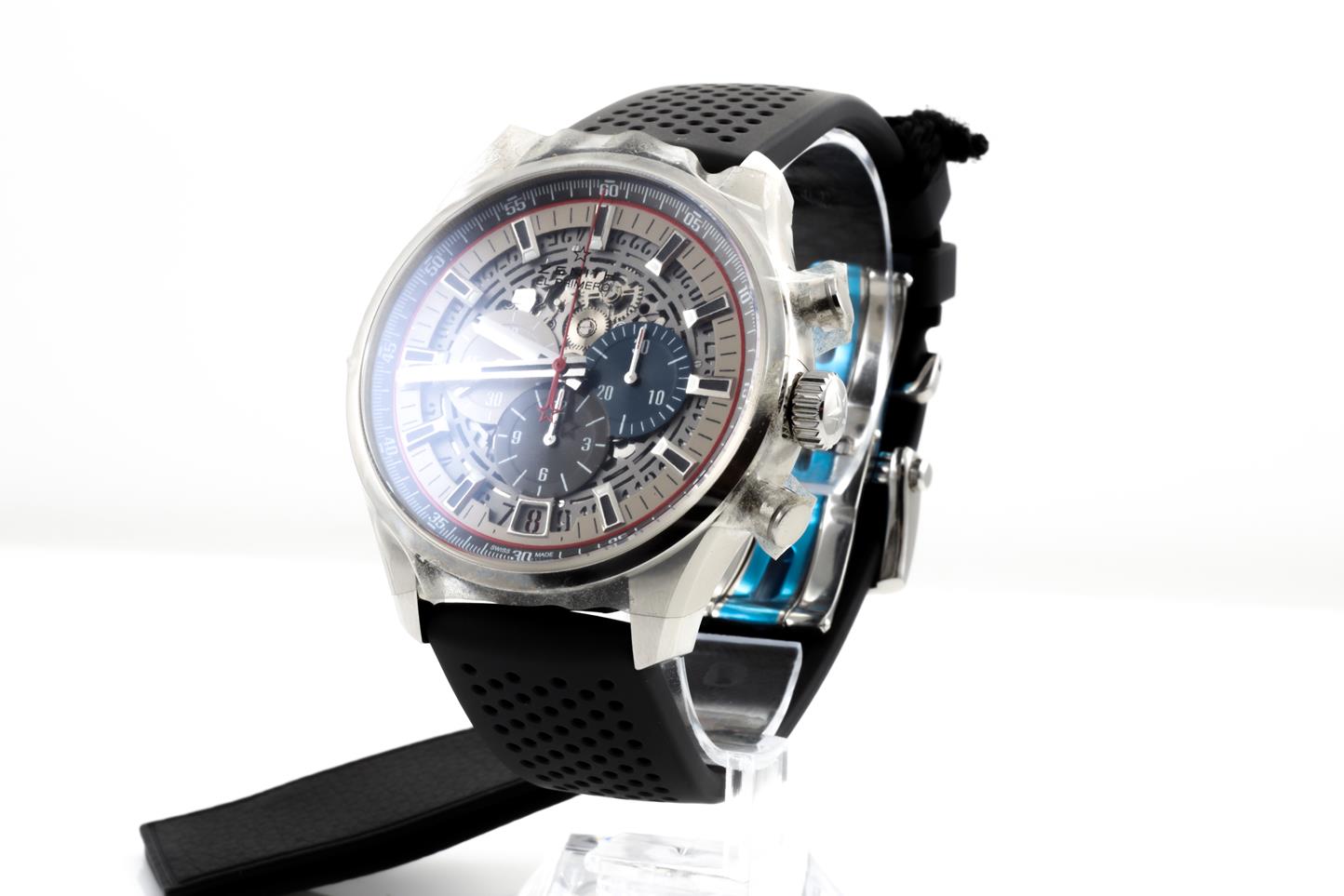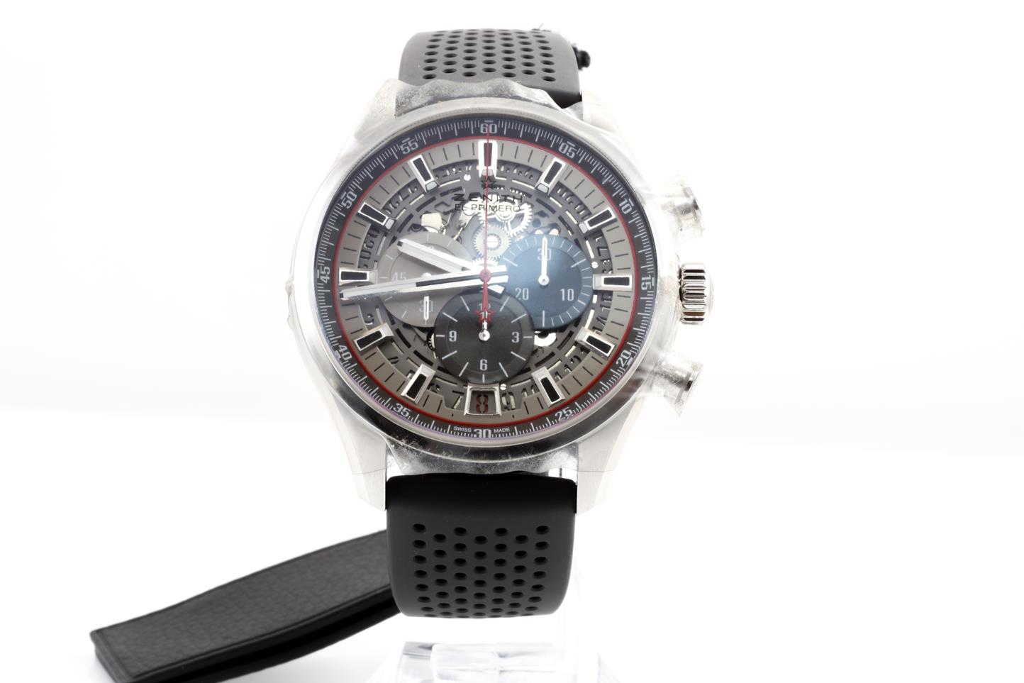 Zenith Chronomaster El Primero automatic mens watch. Silver skeleton chronograph dial, date, case diameter: 45mm, Swiss made. Ref #03.2522.400/69.R576. With Zenith black rubber strap and clasp. With Zenith international warranty card (not stamped) and quick-step guide inside Zenith box. 3 motnh FSA warranty. (New, in original wrapping)