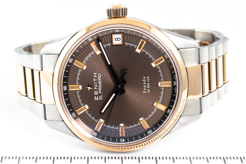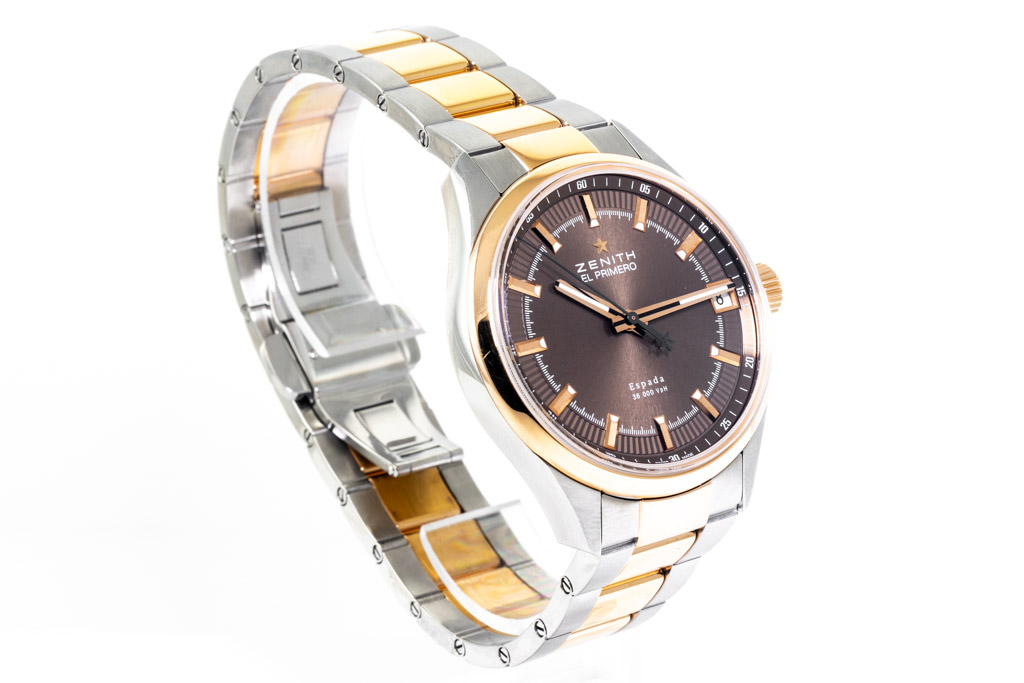 Zenith El Primero Espada 18ct rose gold and stainless steel automatic mens watch. Brown dial, date, case diameter: 40mm, wrist size: 20.5 Swiss made. Ref# 51.2170.4650/75m2170. With Zenith two-tone bracelet and clasp. With Certificate of Authenticity and Zenith box. 3 month FSA warranty applies. (Pre-owned)