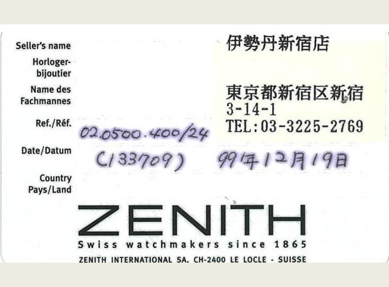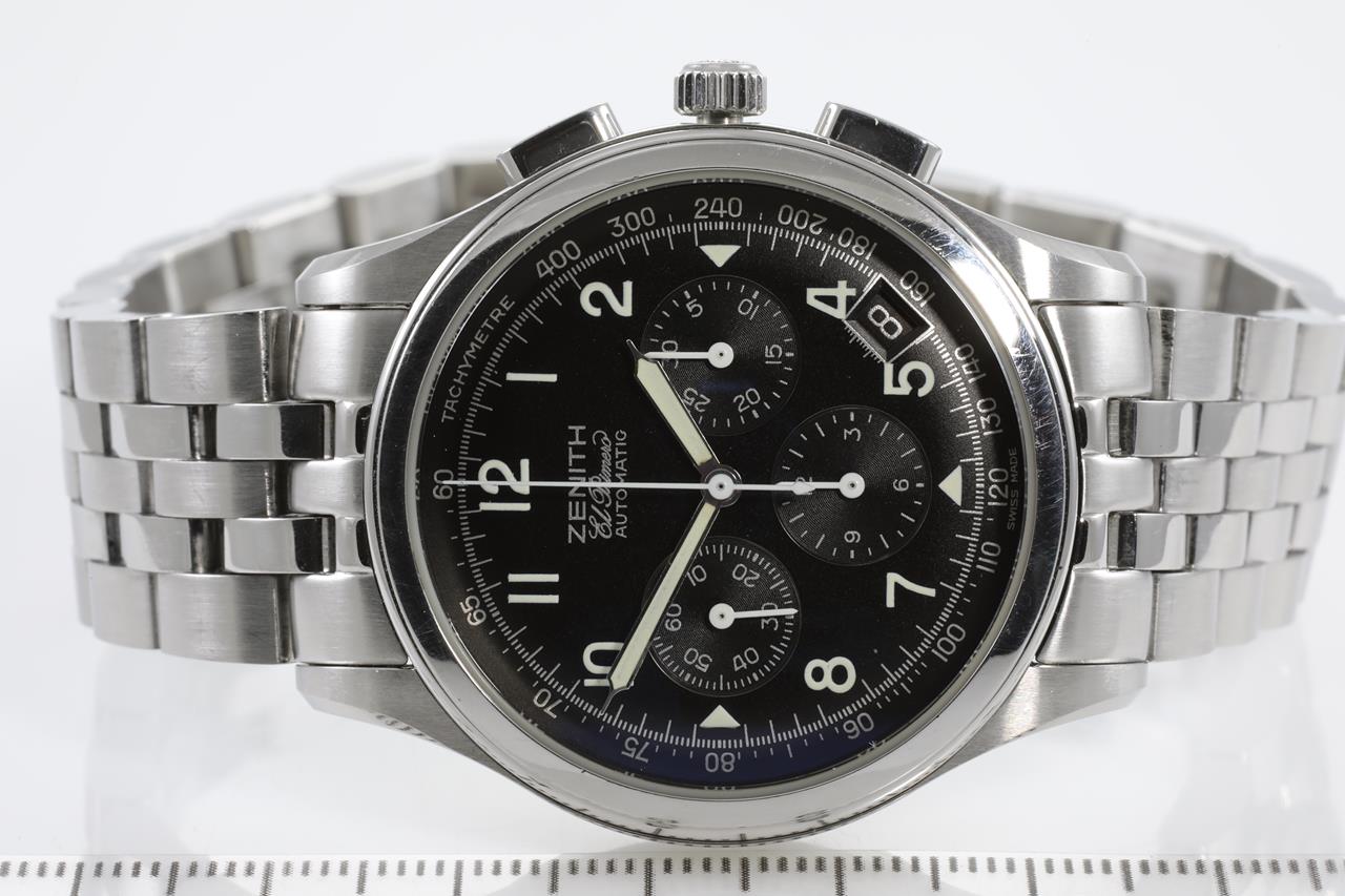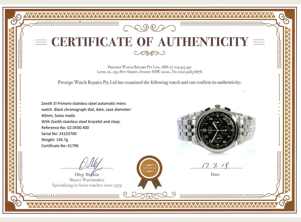 Zentih El Primero stainless steel automatic mens watch. Black chronograph dial, date, case diameter: 40mm, wrist size: 19cm, Swiss made. Ref# 02.0500.400. With Zenith stainless steel bracelet and clasp. With certificate of authenticity & Zenitn international guarantee card dated 99/12/19. 3 month FSA warranty. (Pre-owned)