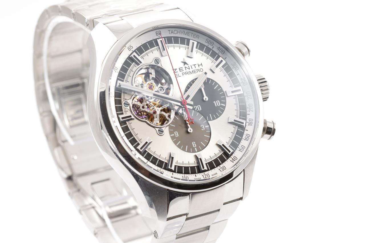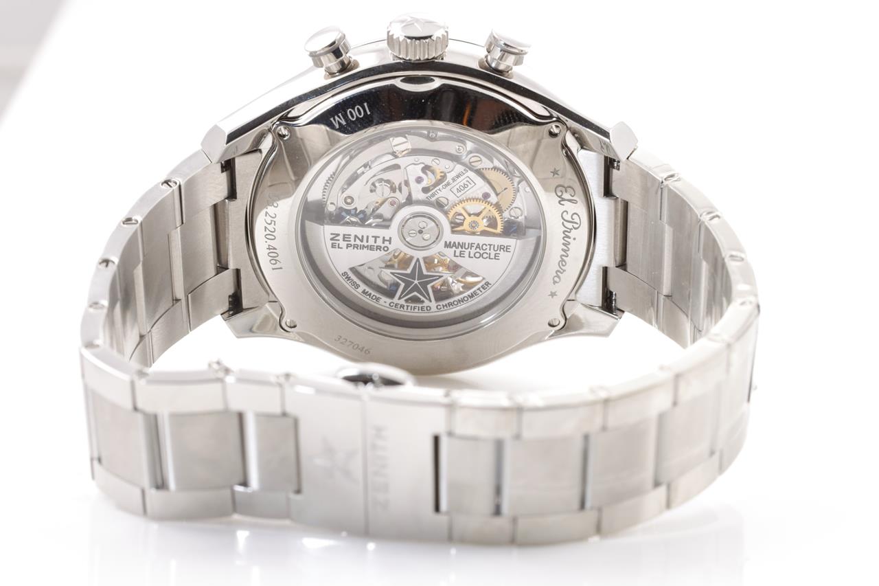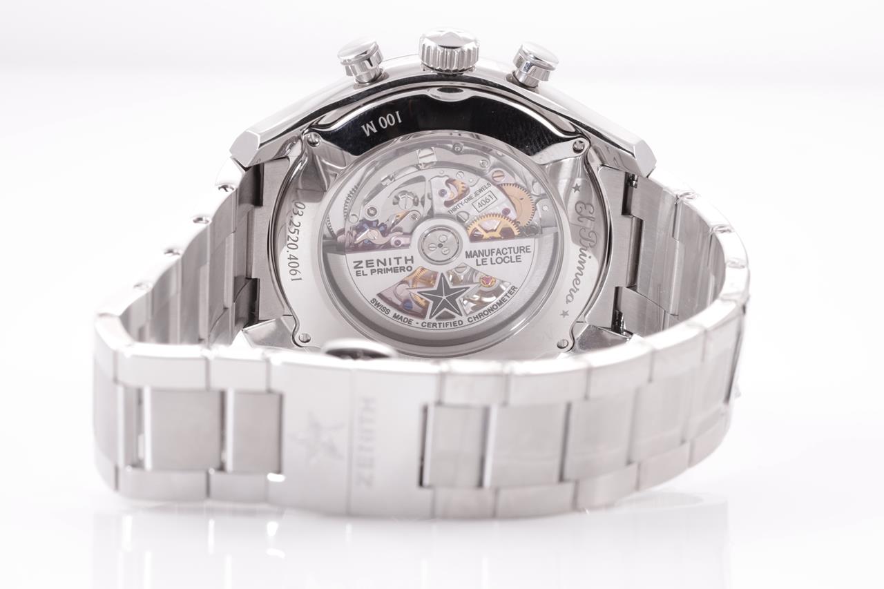 Zenith El Primero stainless steel automatic mens watch. Silver chronograph dial, case diameter: 45mm, wrist size: 19.5cm, Swiss made. Ref# 03.2520.4061/69.M228. With Zenith stainless steel bracelet and clasp. Note: minor scratches on case and bracelet due to being display stock. With Zenith International Warranty Card (not stamped) and quick-step guide booklet. 3 month FSA warranty. (As New)