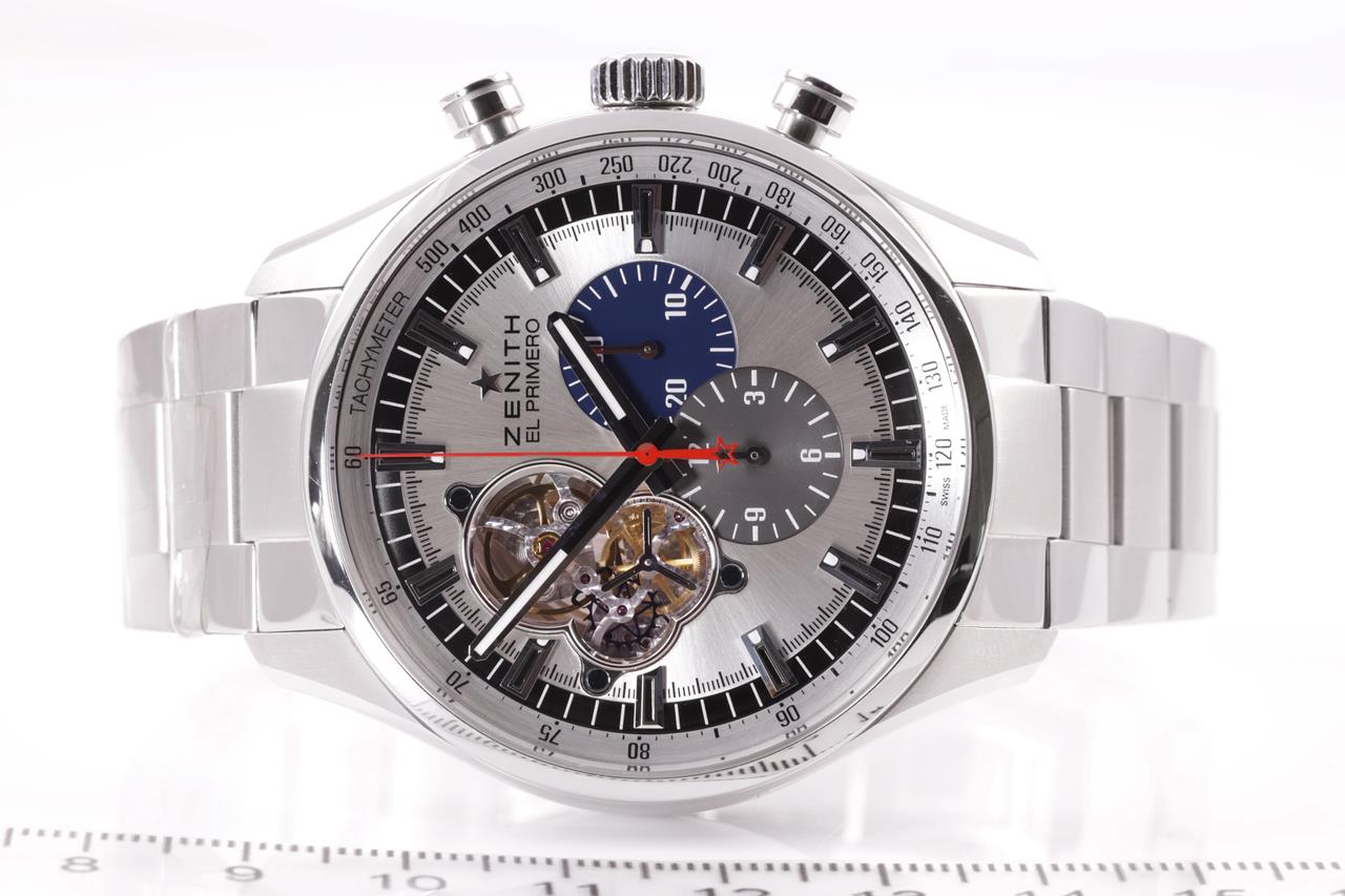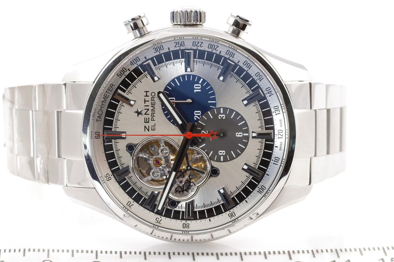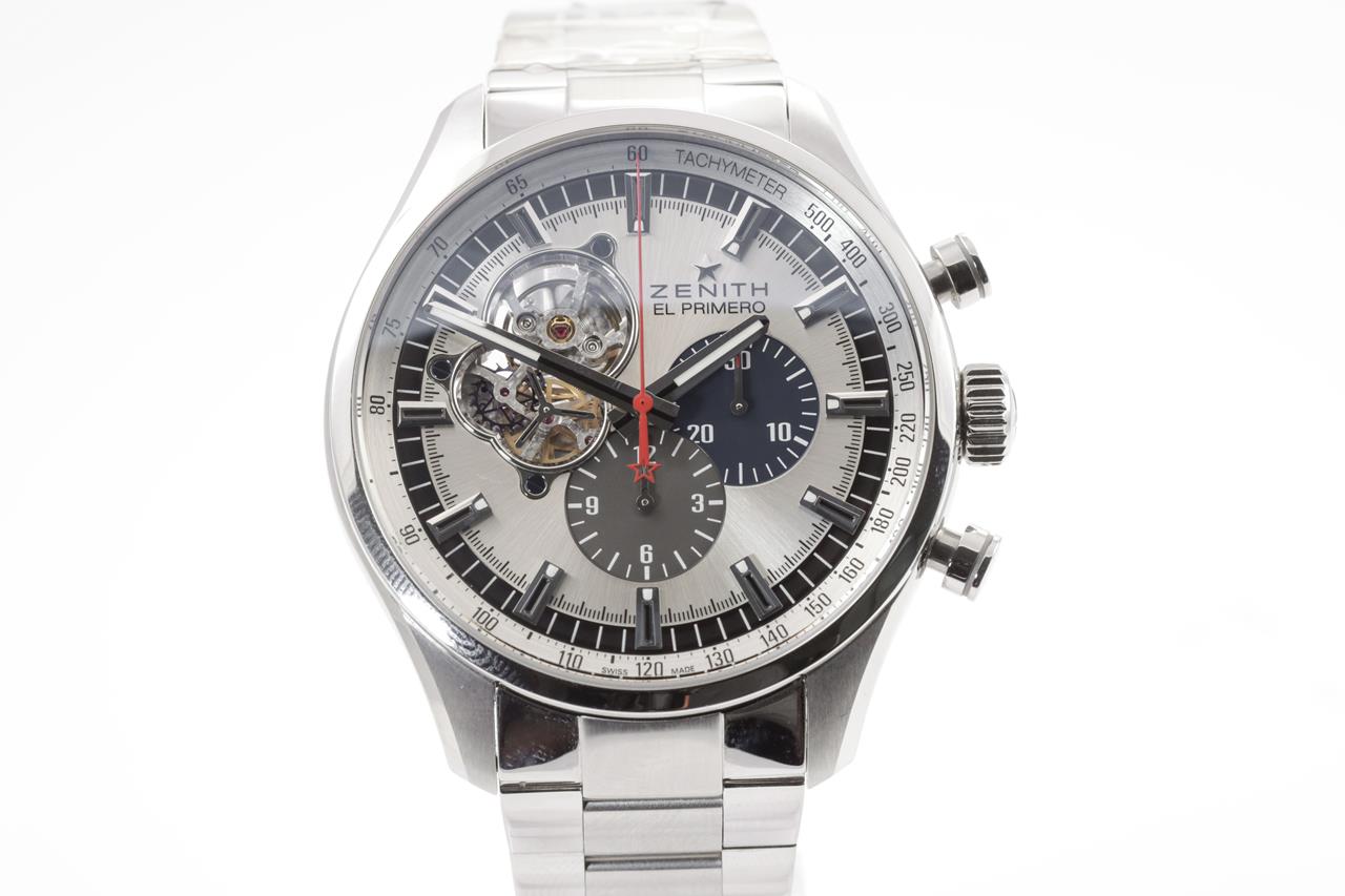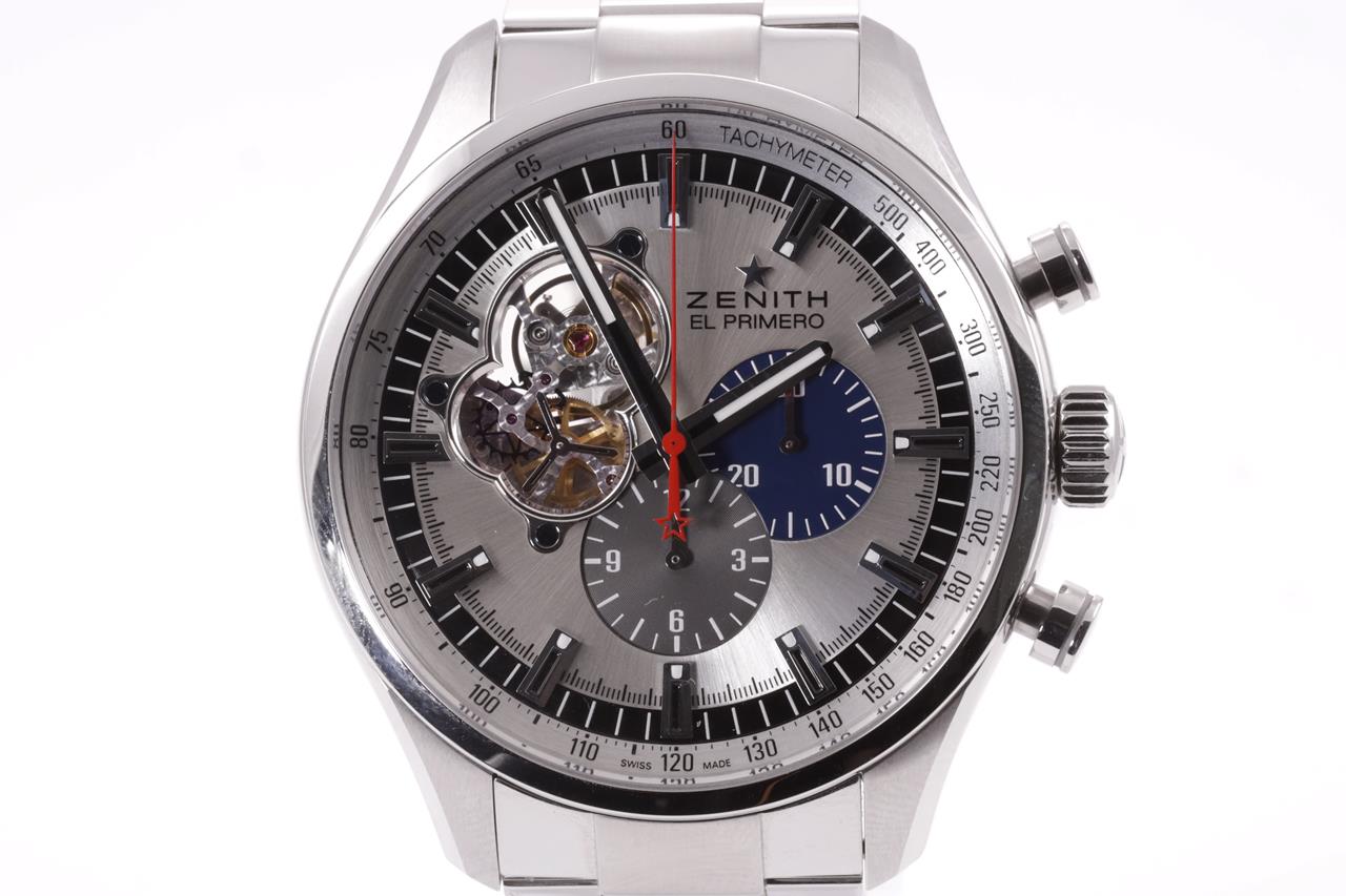 Zenith El Primero stainless steel automatic mens watch. Silver chronograph dial, case diameter: 45mm, wrist size: 19.5cm, Swiss made. Ref# 03.2520.4061/69.M228. With Zenith stainless steel bracelet and clasp. Note: minor scratches on case and bracelet due to being display stock. With Zenith International Warranty Card (not stamped) and quick-step guide booklet. 3 month FSA warranty. (As New)
