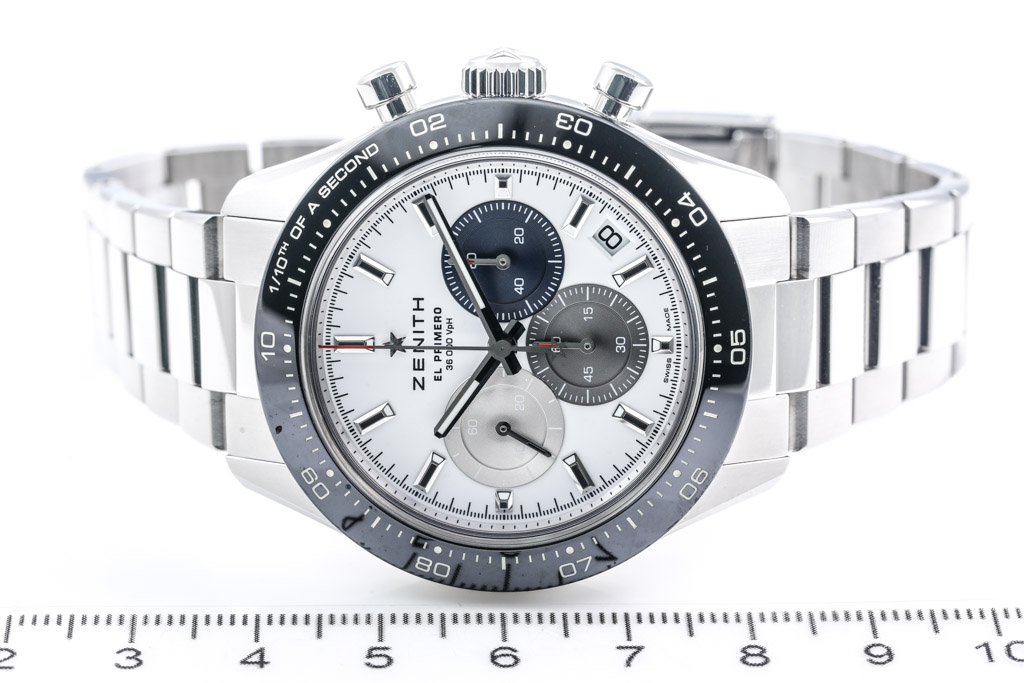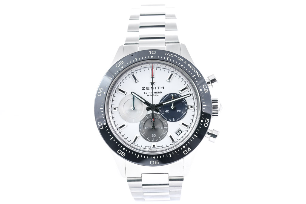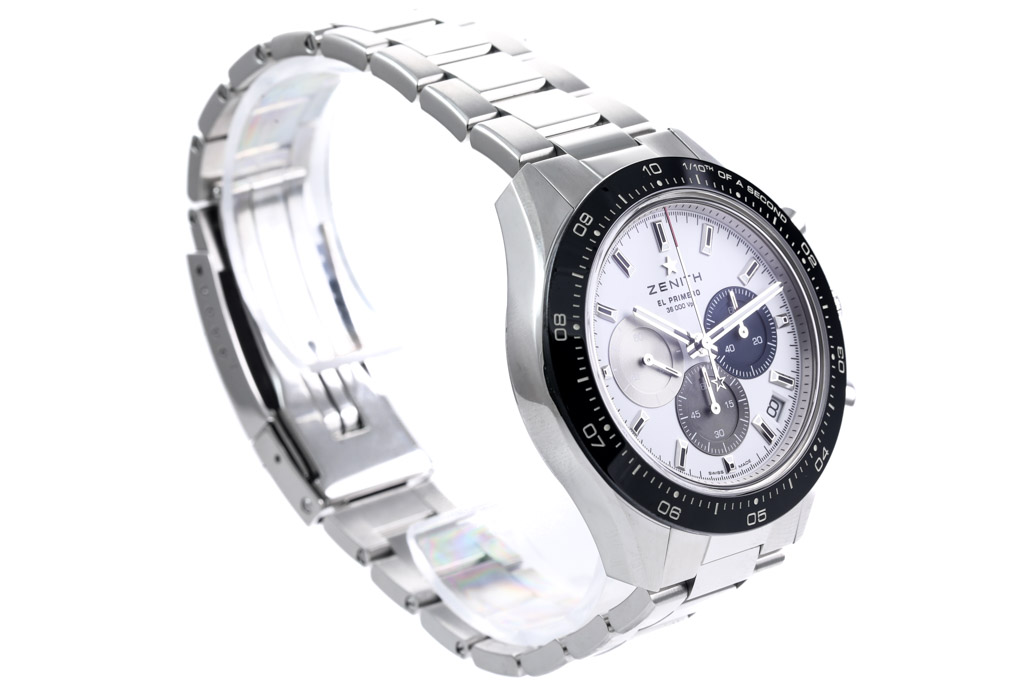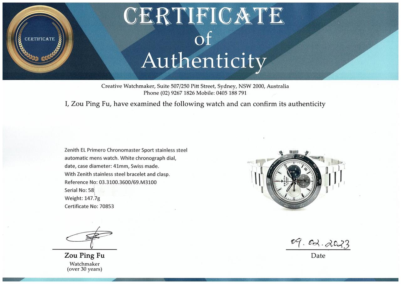 Zenith EL Primero Chronomaster Sport stainless steel automatic mens watch. White chronograph dial, date, case diameter: 41mm, wrist size: 20.5cm, Swiss made. Ref# 03.3100.3600/69.M3100. With Zenith stainless steel bracelet and clasp. With Certificate of Authenticity, Zenith International Warranty Card dated 18/06/2022 and Zenith box. Balance of 2 year Zenith Warranty. (Pre-owned)