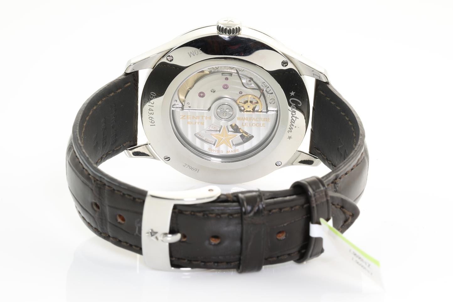 Zenith Elite Moonphase stainless steel automatic mens watch. Silver dial, date, small seconds, case diameter: 40mm, Swiss made. Ref #03.2143.691/01.C498. With Zenith brown leather strap and clasp. Note: slight wear on strap due to being display stock. With Zenith international warranty card (not stamped) and instruction manual inside Zenith box. 3 month FSA warranty. (New)