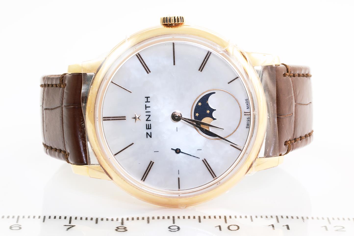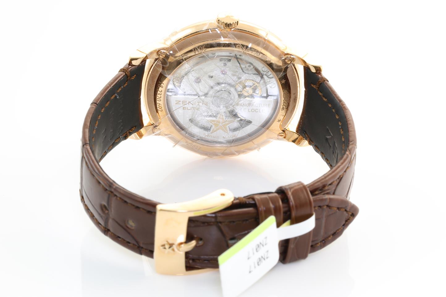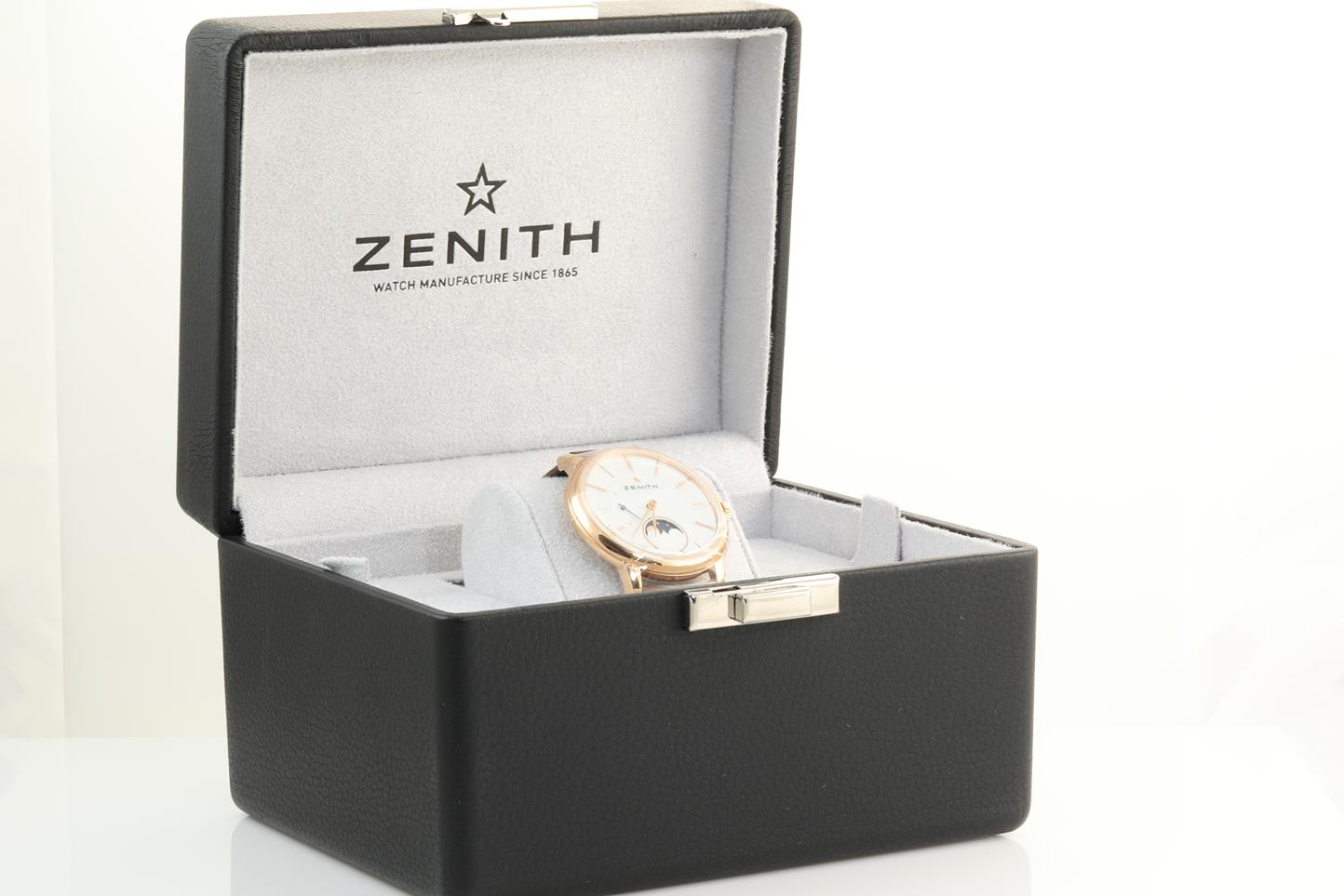 Zenith Elite Ultra Thin Lady Moonphase 18ct rose gold automatic watch. Mother of Pearl dial, case diameter: 36mm, Swiss made. Ref #18.2320.692/80.C713. With Zenith brown leather strap and 18ct gold clasp. With Zenith international warranty card (not stamped) and quick step guide booklet inside Zenith box. 3 month FSA warranty. (New, in original wrapping)