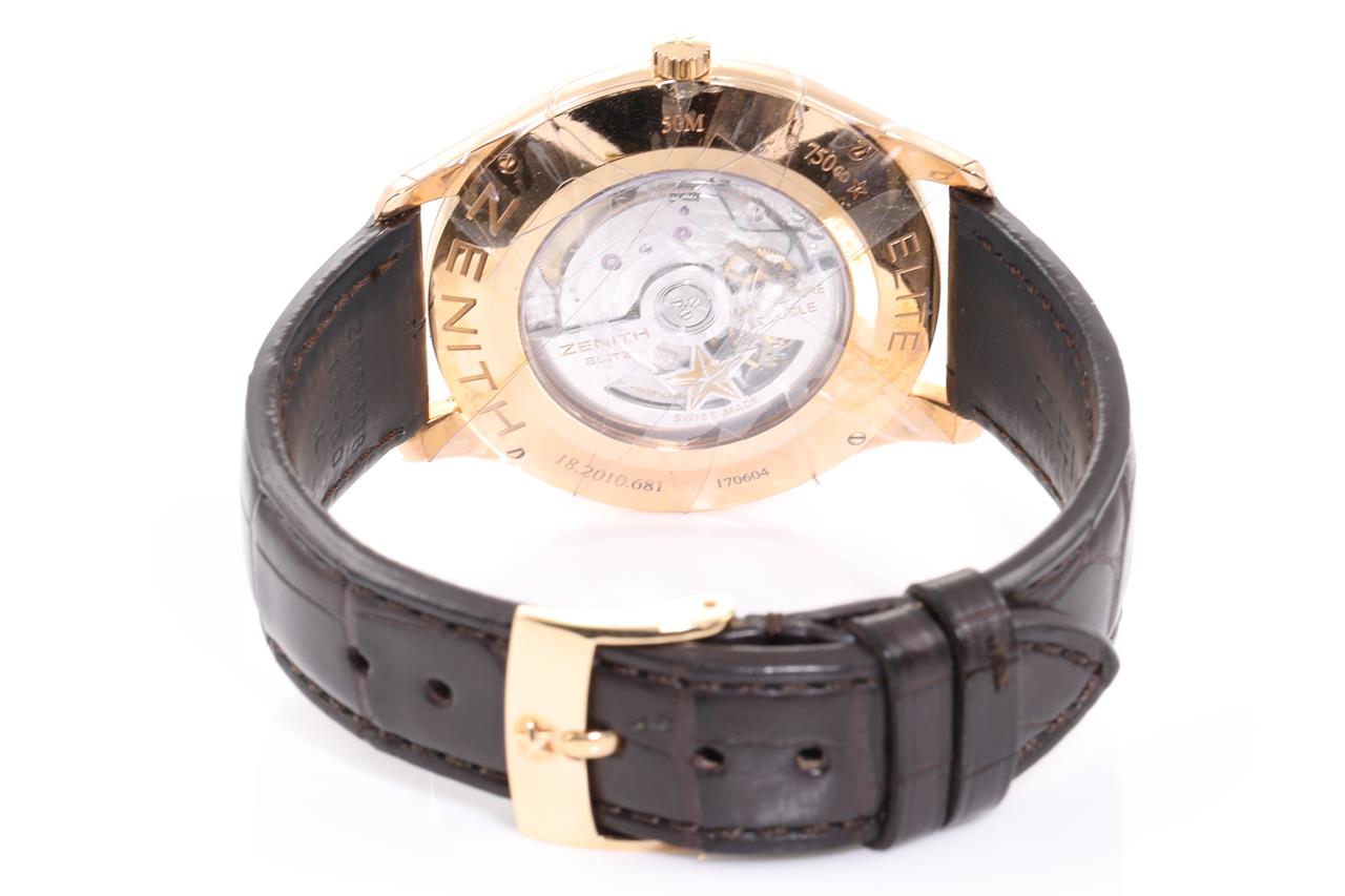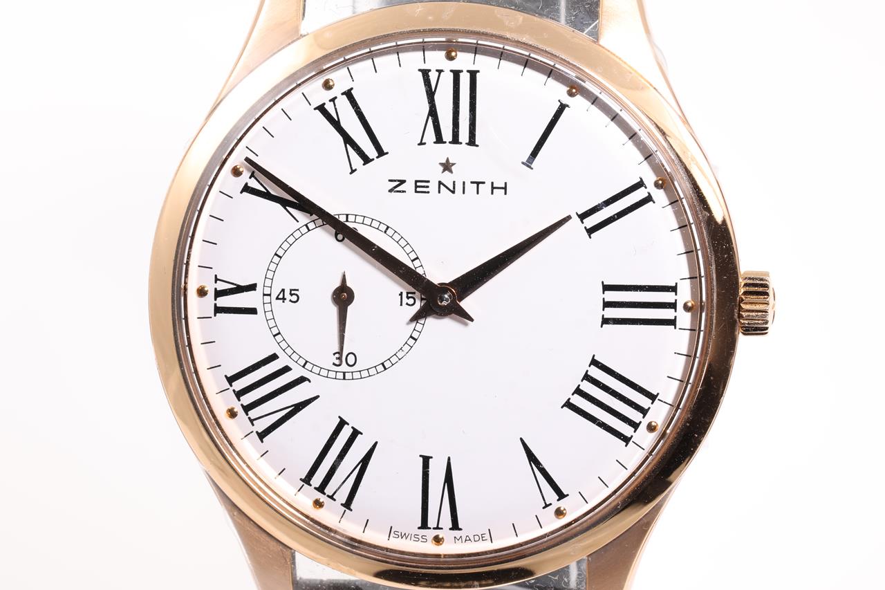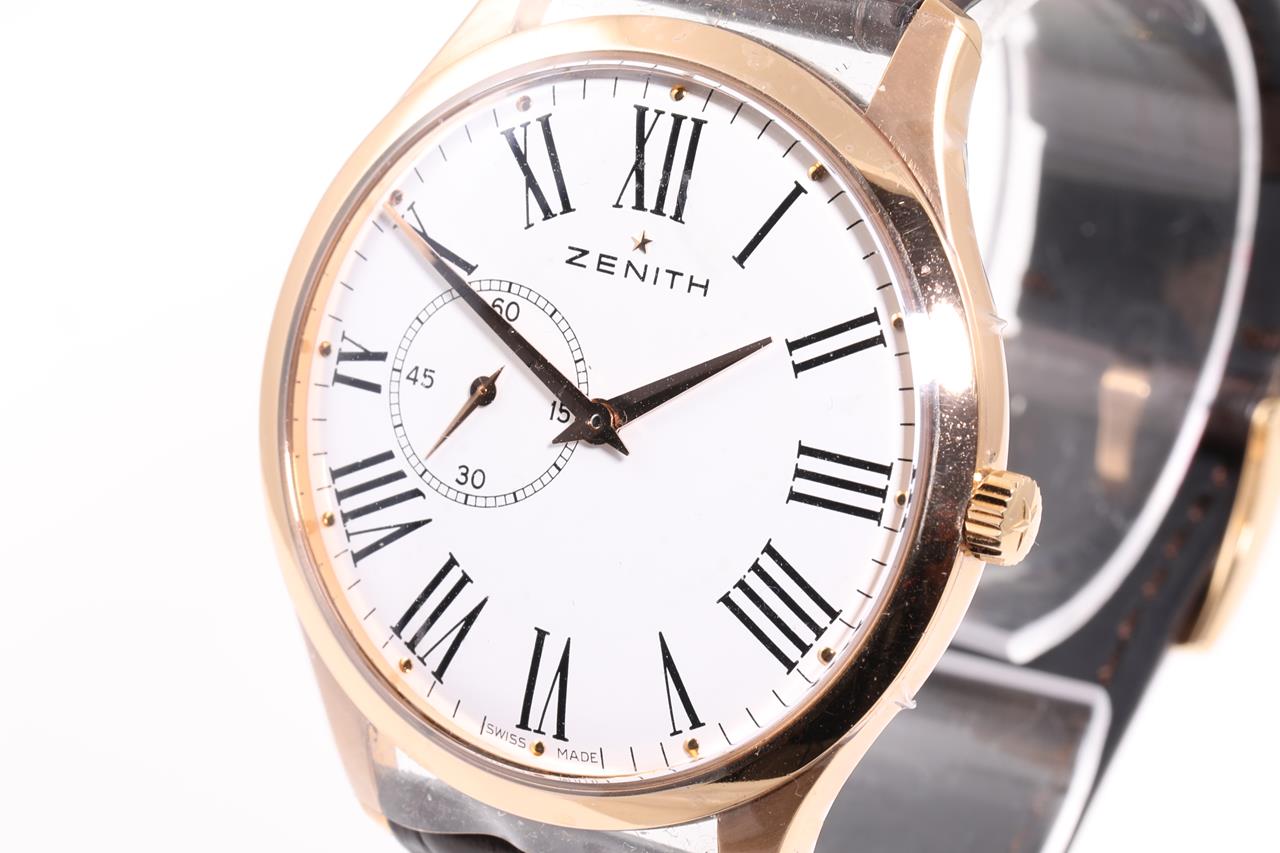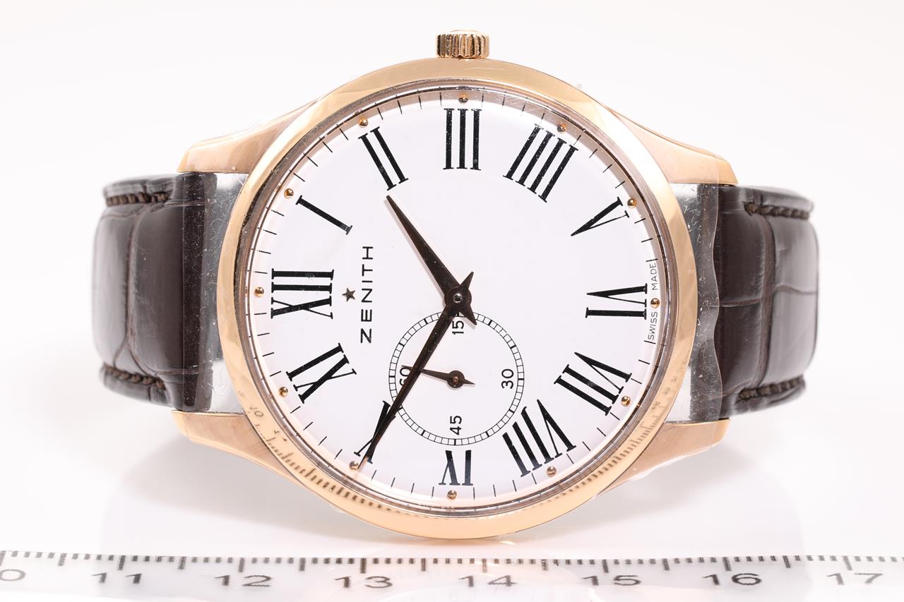 Zenith Heritage Ultra Thin 18ct rose gold automatic mens watch. White dial, small second, case diameter: 40mm, length: 21.5cm, Swiss made. Ref# 18.2010.681/11.C498. With Zenith brown leather strap and buckle. Note: light wear on strap due to being display stock. With Zenith International Warranty Card (not stamped). No box provided. 3 month FSA warranty. (As New)